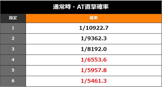 通常時の「AT直撃確率」は高設定ほど高く、設定1と6では2倍の差が存在。分母が大きいので簡単に確認はできませんが、もし複数回発生すれば高設定の大チャンスです!