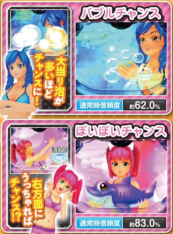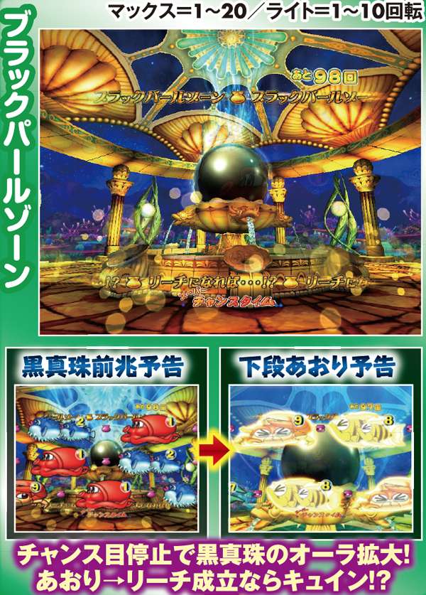 ブラックパールゾーン中は、基本的に上下段に同図柄が停止し、中ライン次第でチャンス目が成立するが、上下段に同図柄が停止しない"純ハズレ"が出現した場合は大当り濃厚のタッチ全回転へと発展する。