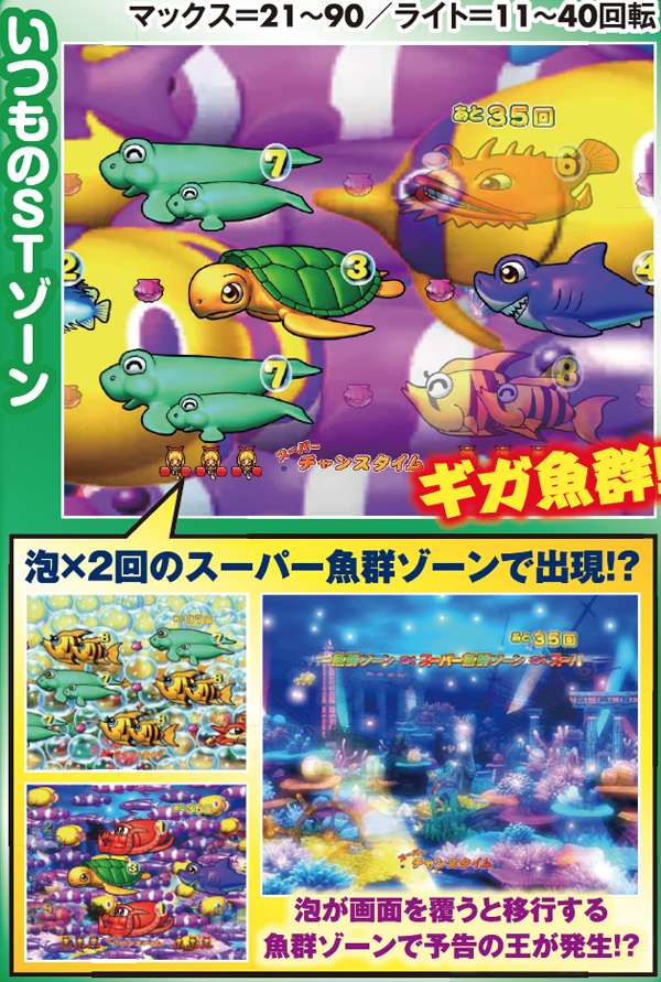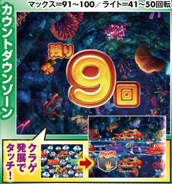 電サポ残り10回転からは、リーチ成立前に出現するキャラによって、その後の展開が異なる。クラゲの登場で、大チャンスのタッチSPへと発展だ。