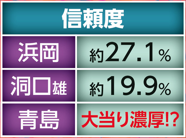 優勝戦ゾーン限定リーチのG1では対戦キャラによって信頼度が変化し、青島が登場すれば超激アツだ。