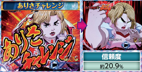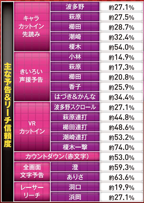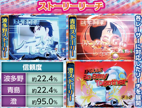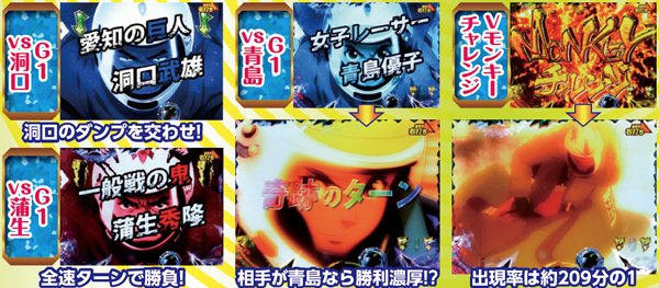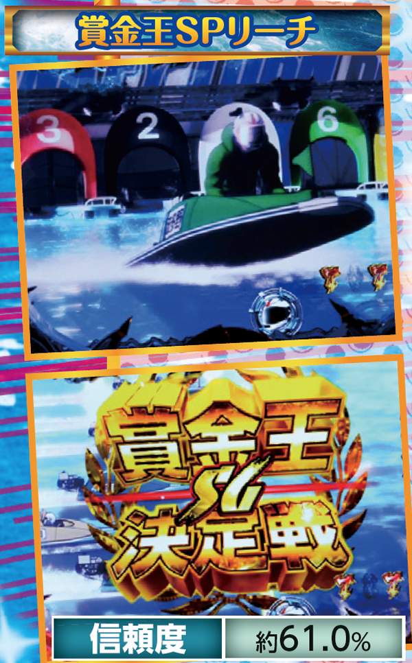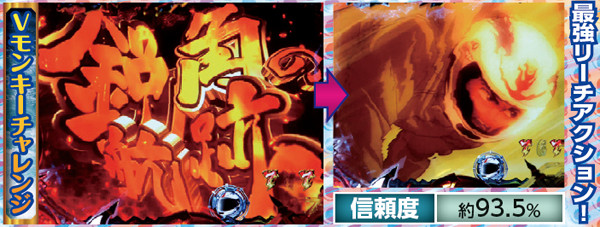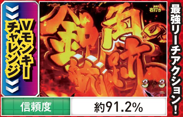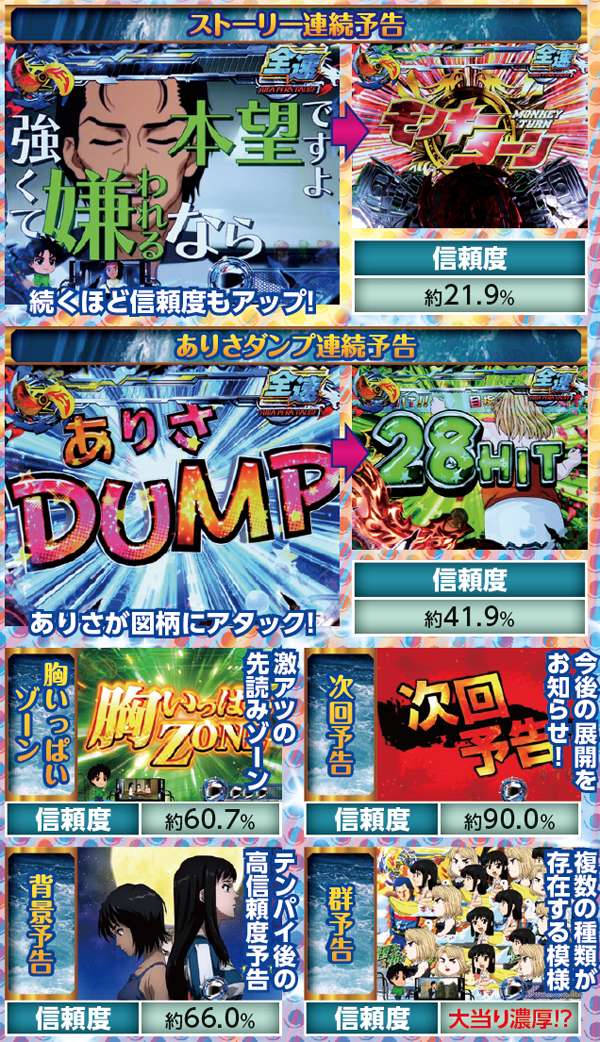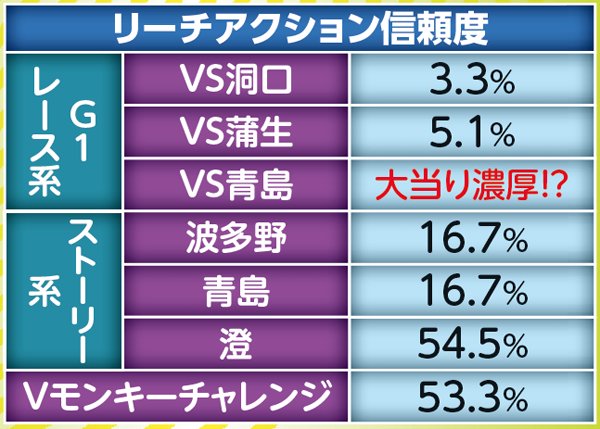 Vモンキーチャレンジは信頼度9割超を誇る激アツ演出。ストーリーリーチはキャラによって信頼度が変化し、澄なら大当り目前となる。賞金王SPリーチは発生した段階で半数以上が大当りと、期待してヨシ!