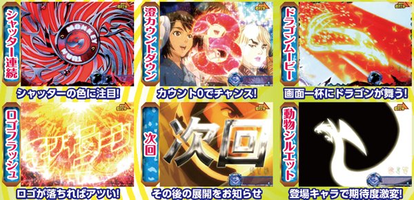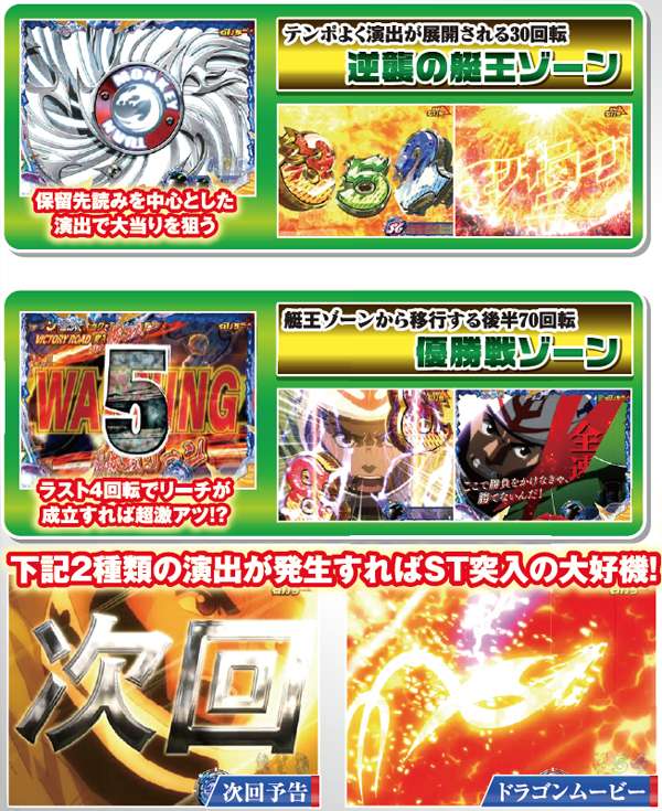 初当り後に突入する時短は、『逆襲の艇王』『優勝戦』の前後半二部構成となっている。いずれも次回予告かドラゴンムービーが発生すれば、大当り&ST突入の大チャンスとなるぞ。