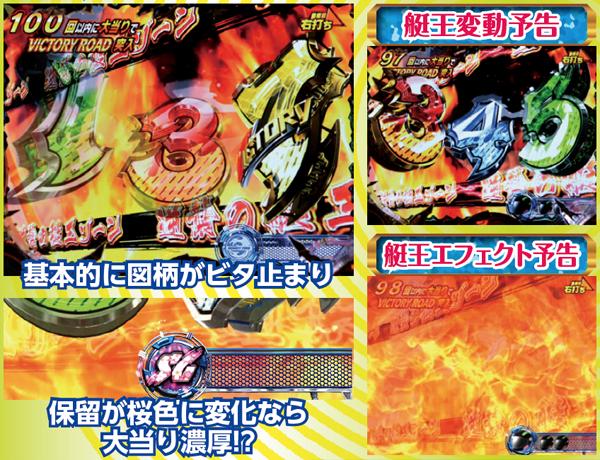 時短0~30回転までは即当りがメイン。注目したいのは艇王変動や艇王エフェクトの先読み系で、いずれも回数で期待度が変化し、後者はエフェクトが赤なら大当り濃厚だ。また、保留が桜柄に変化しても超激アツとなるぞ。