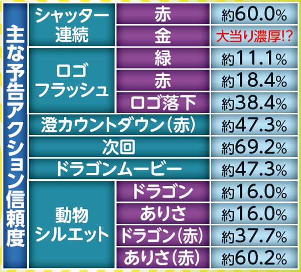 時短後半は多彩な予告が存在し、いずれも赤色アクションの出現で期待大。なお、動物シルエットはペンギンが出現した場合は大当り濃厚となる。