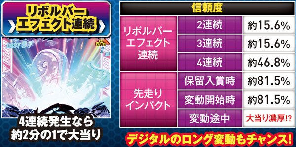 即当りがメインとなる前半は、デジタルのロング変動が発生すれば期待大。その呼び水となるのが先読みのリボルバーエフェクト連続や先走りインパクトで、後者なら激アツ必至だ。