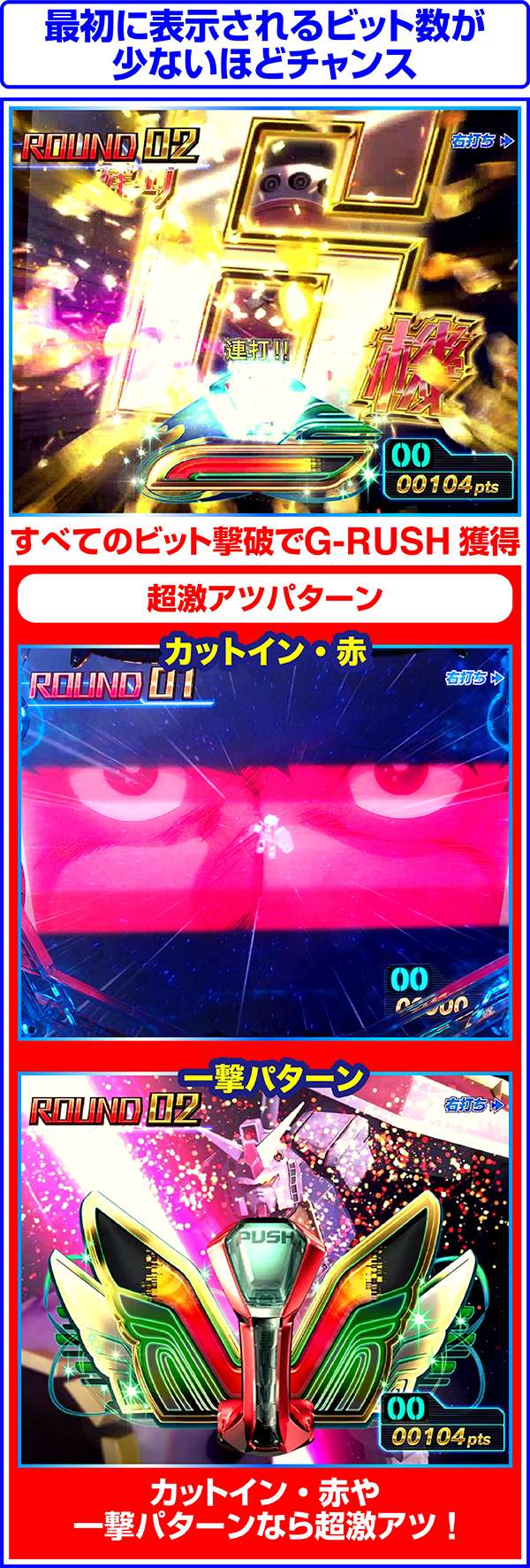 また、カットイン・赤や一撃パターン、残りビット数1機はG-RUSH突入濃厚となっているぞ。