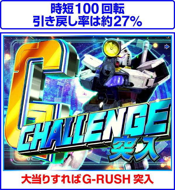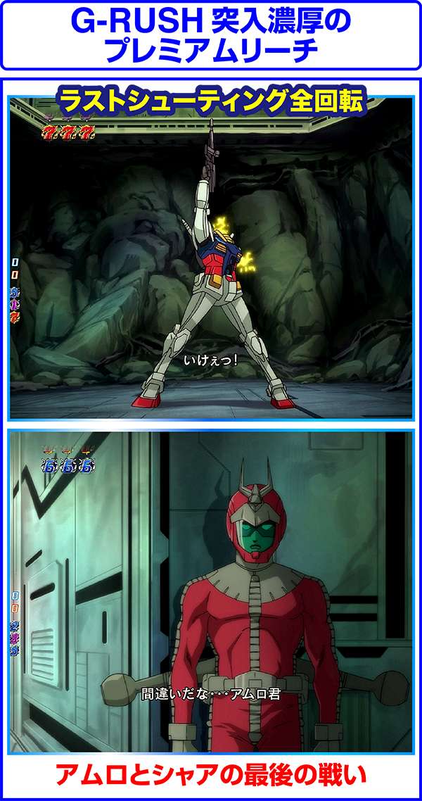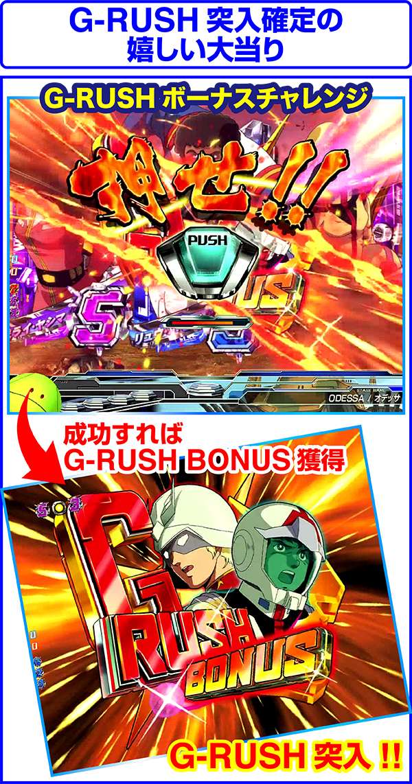 G-RUSHボーナスチャレンジから獲得の可能性のある大当り。G-RUSHボーナスチャレンジは連邦軍/ジオン軍リーチハズレ後などから発展する。