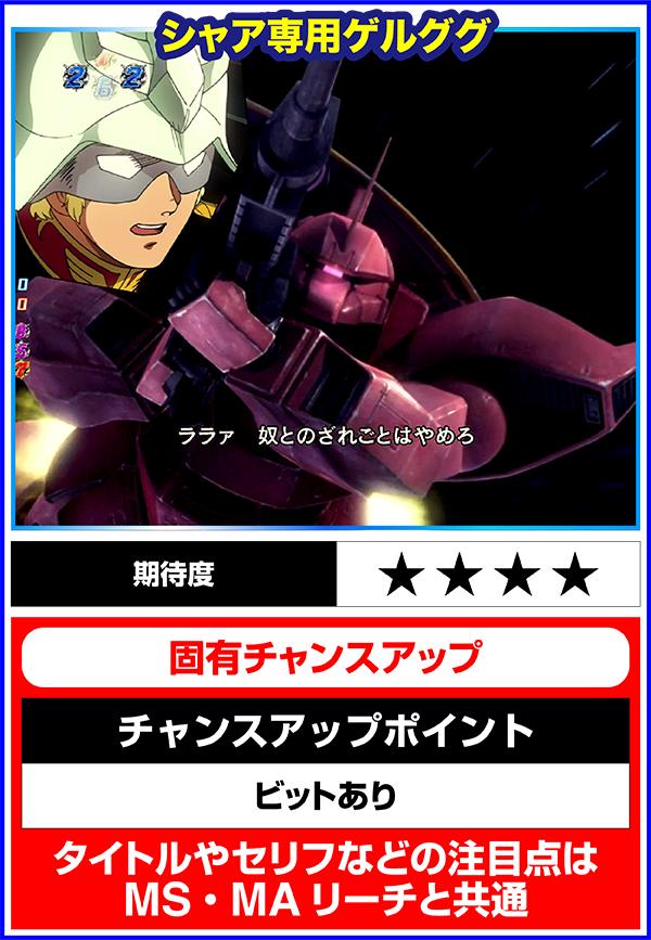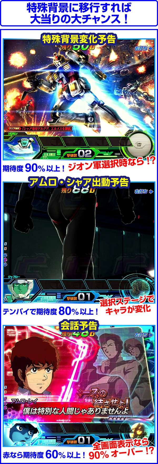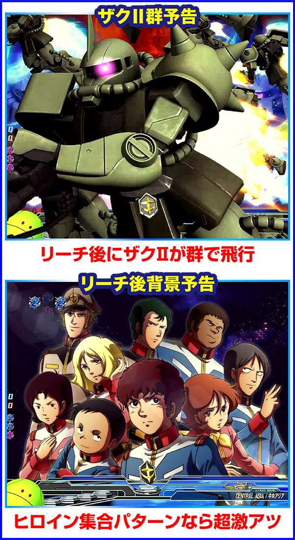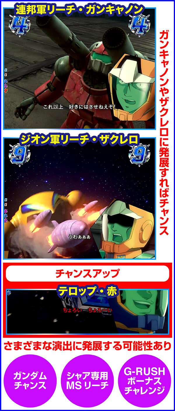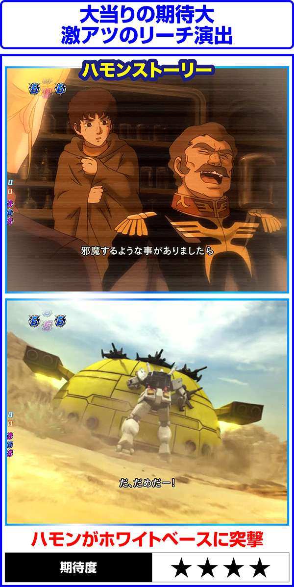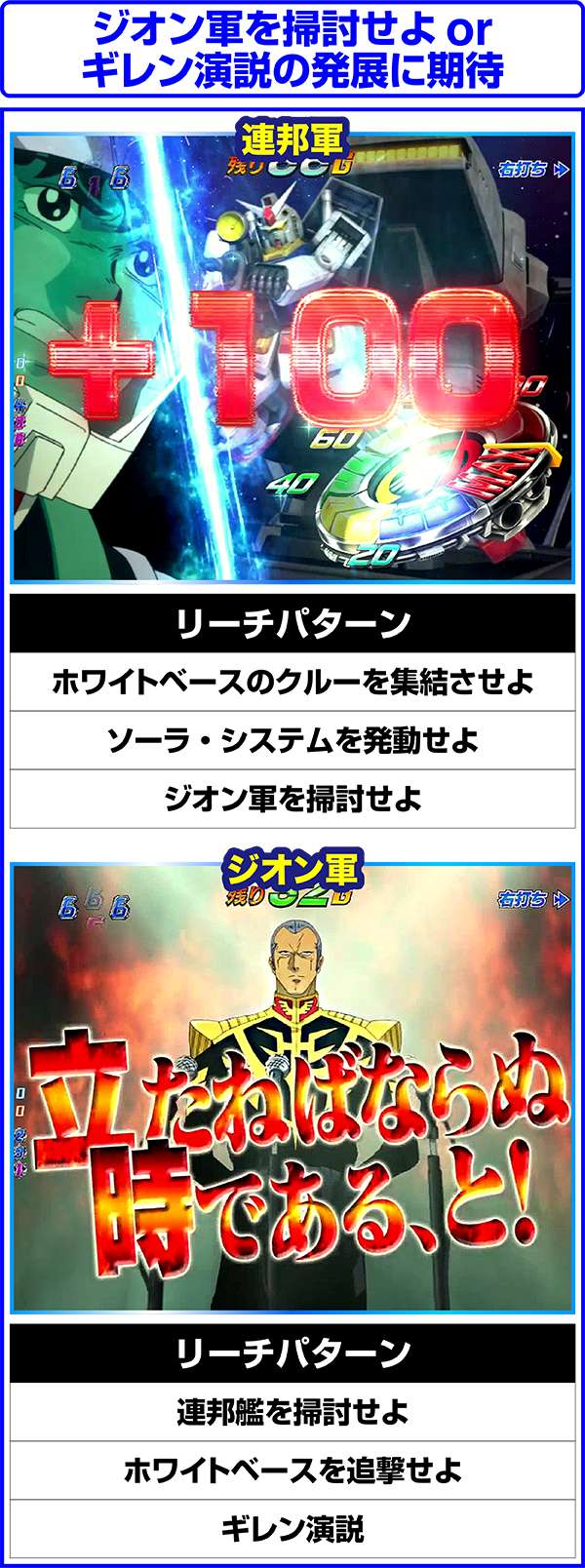 連邦軍時は「ジオン軍を掃討せよ」がチャンスになり、獲得するポイント数が多いほど期待度上昇。ジオン軍時はチャンスアップの存在しない「ギレン演説」なら激アツ。