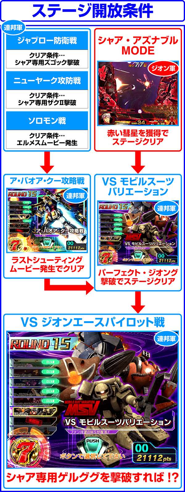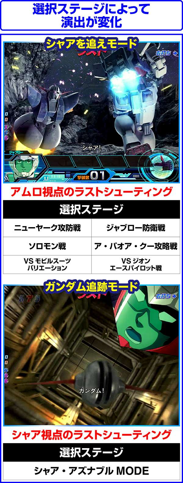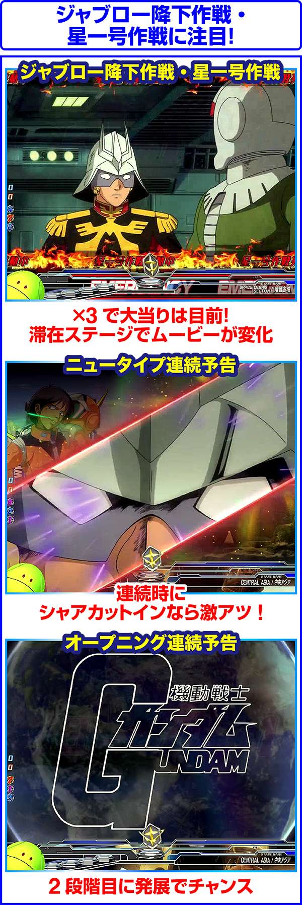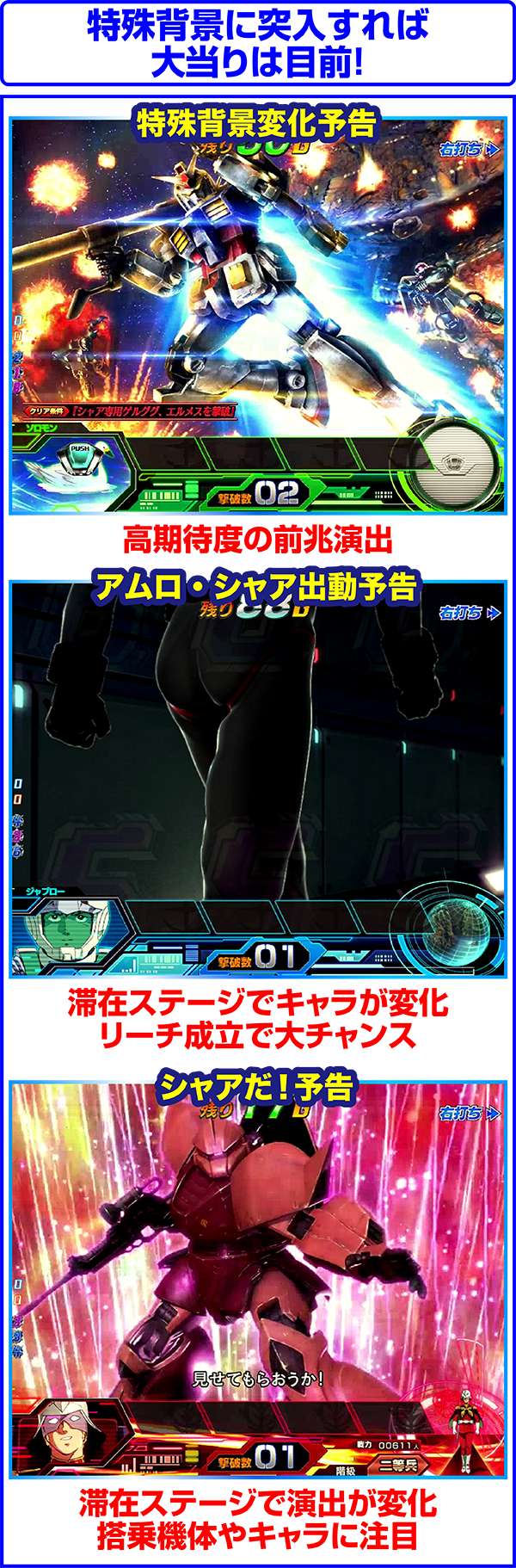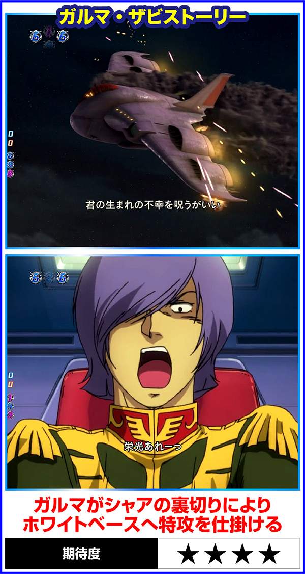 連邦軍時は「ジオン軍を掃討せよ」がチャンスになり、獲得するポイント数が多いほど期待度上昇。ジオン軍時はチャンスアップの存在しない「ギレン演説」なら激アツ。