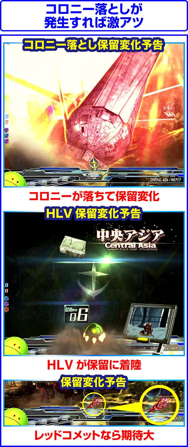 保留変化時は高期待度となる赤やレッドコメットに期待。コロニー落としからの変化時は激アツだ。