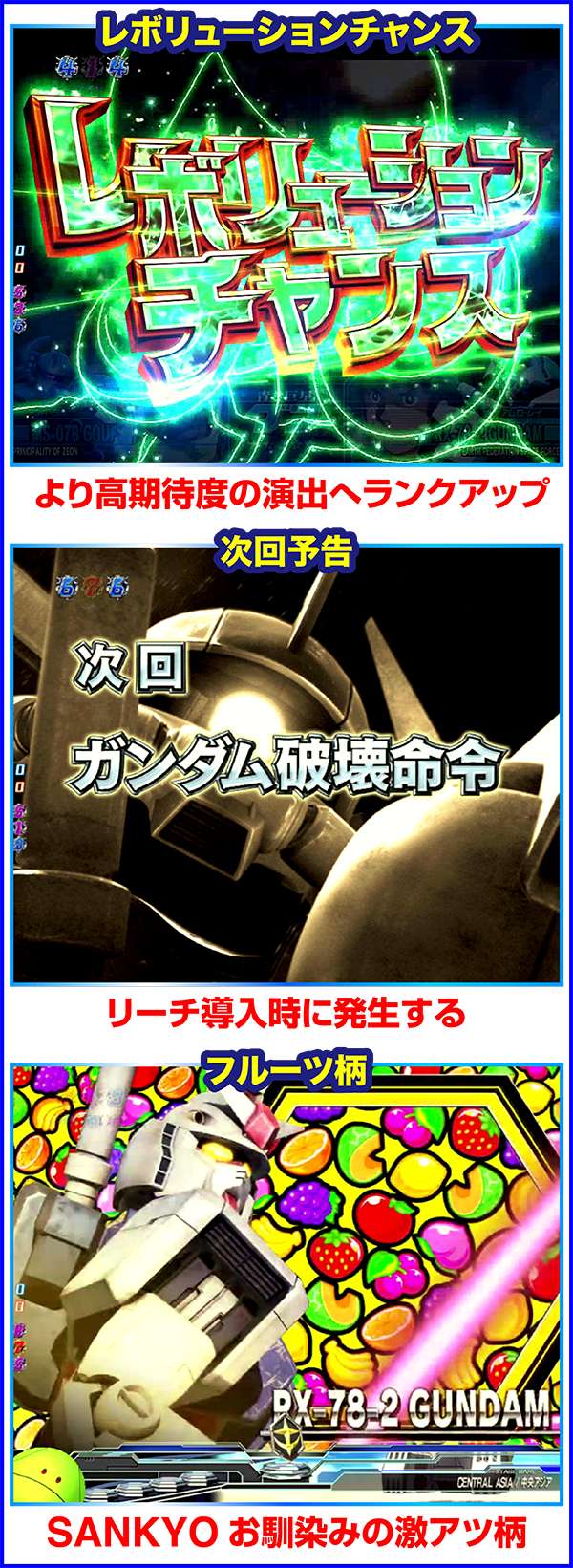 レボリューションチャンスはリーチ中に発生の可能性があり、発生時はより高期待度のリーチへ発展する。フルーツ柄も、もちろん発生=激アツだ。