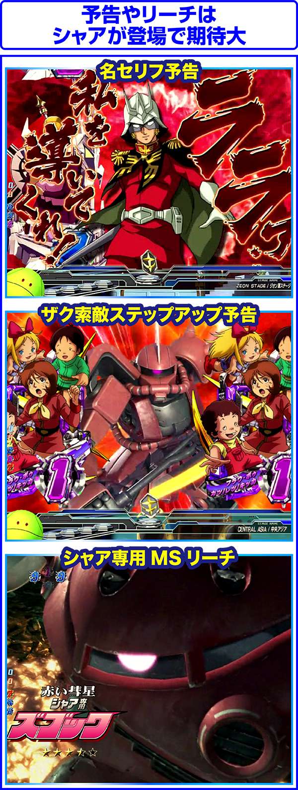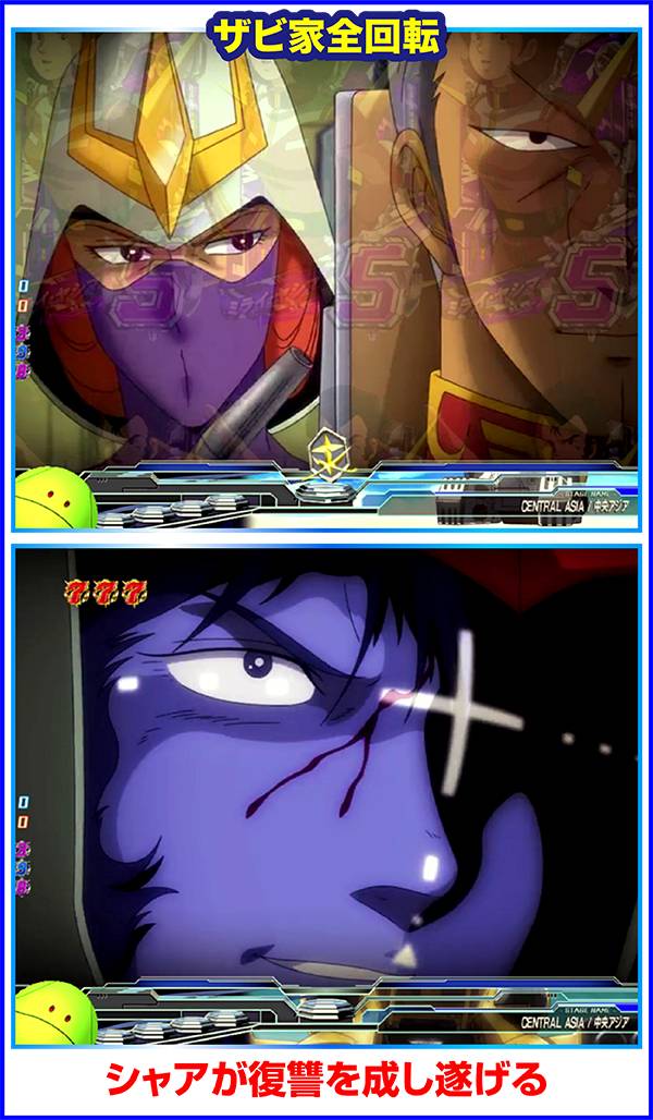 シャアだ!予告はステージによって演出が異なり、連邦軍ならララァがいれば、ジオン軍ならジオングに搭乗すれば超激アツとなる。