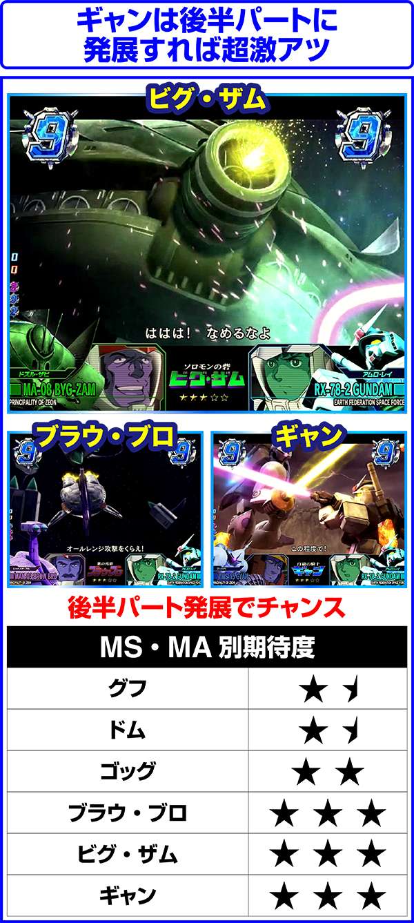 ギャンとビグ・ザムは発展すればチャンス。今までのシリーズと同様に、ギャンは後半に発展すれば超激アツとなる。