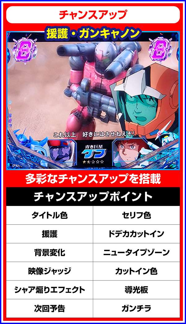チャンスアップ演出はシャア専用MSリーチと共通の部分も多く、タイトル、セリフ、カットイン、導光板は赤ならばチャンス、それ以外は出現した時点でチャンスとなる。