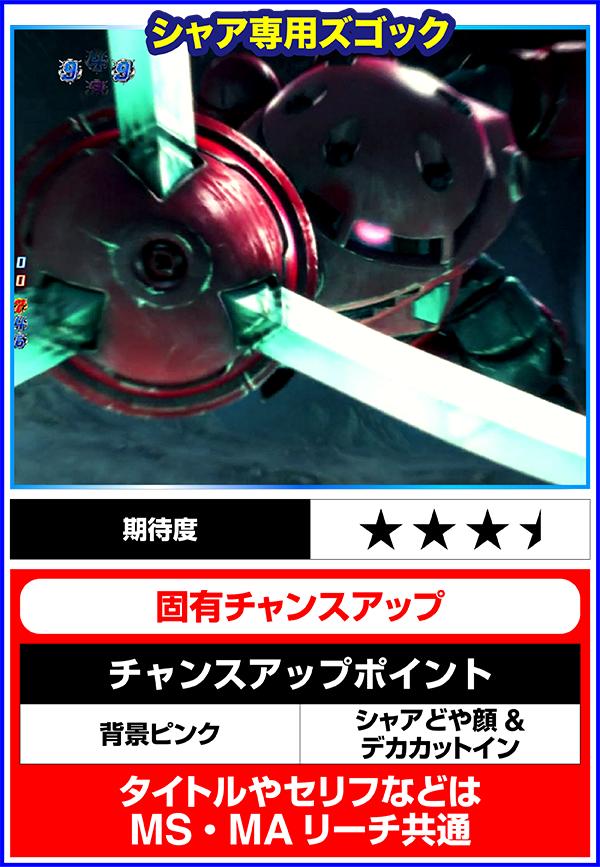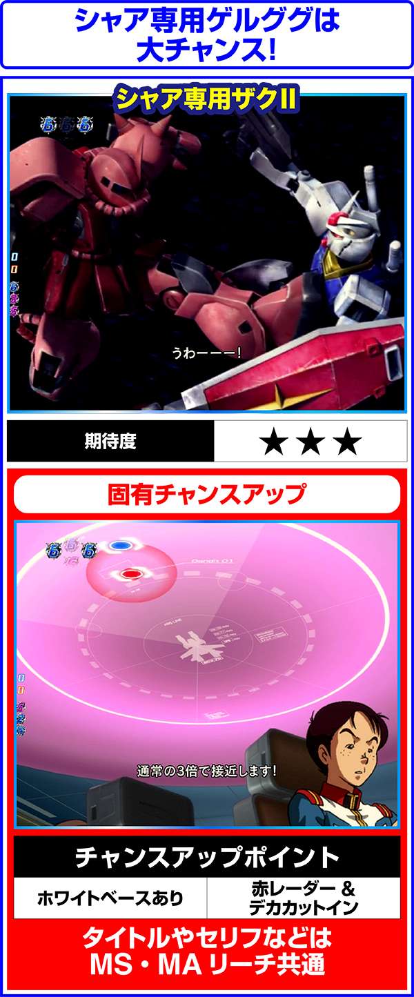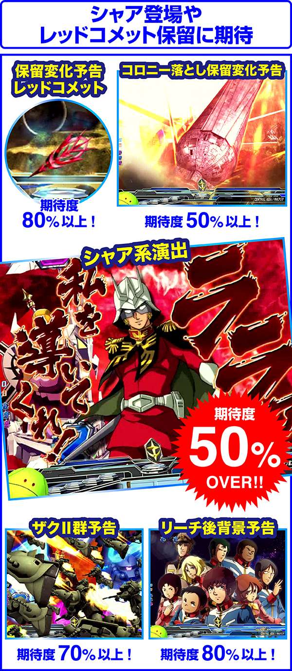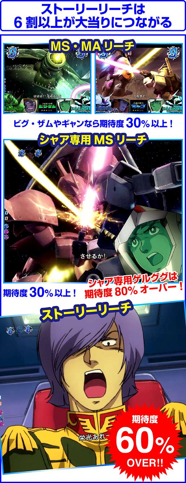 そのほかの注目ポイントは、シャア専用ゲルググ発展時。チャンスアップが出現すれば期待度90%or超激アツと大当りは目前となるぞ。