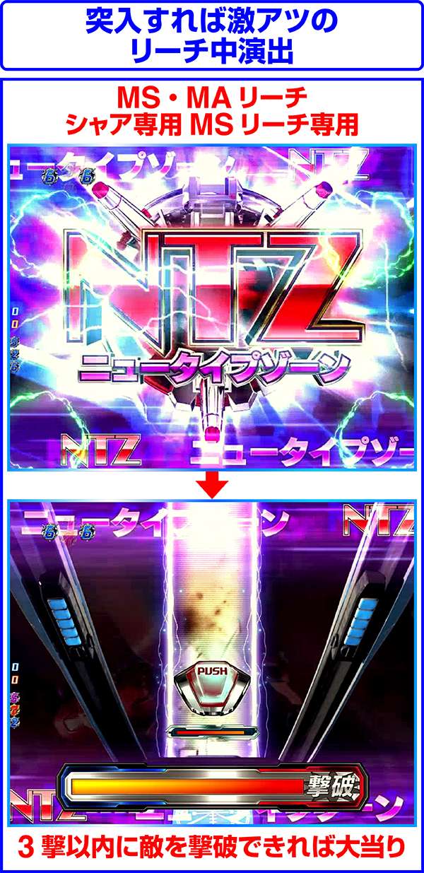 MS・MAリーチとシャア専用MSリーチ中に出現する可能性があるチャンスアップ演出。あおり演出からロゴが停止すれば突入し、3撃以内に敵を撃破すれば大当りとなる。