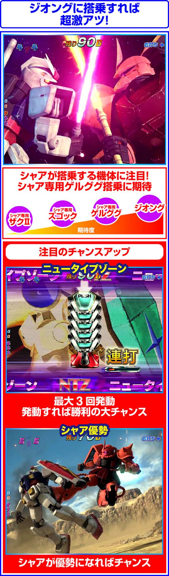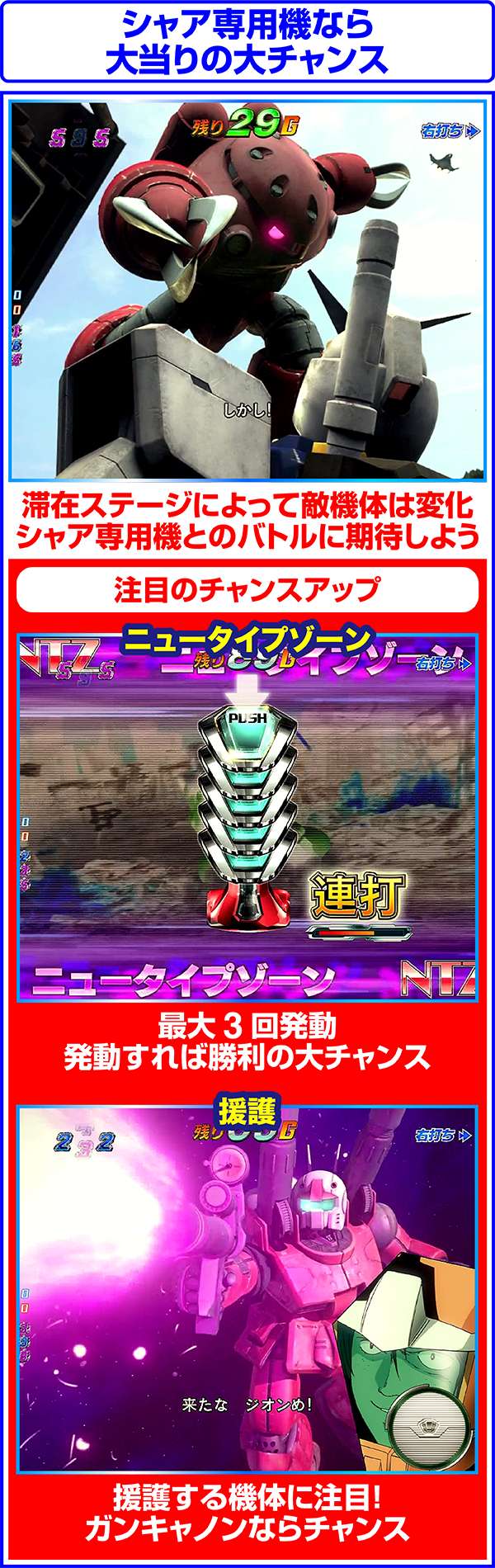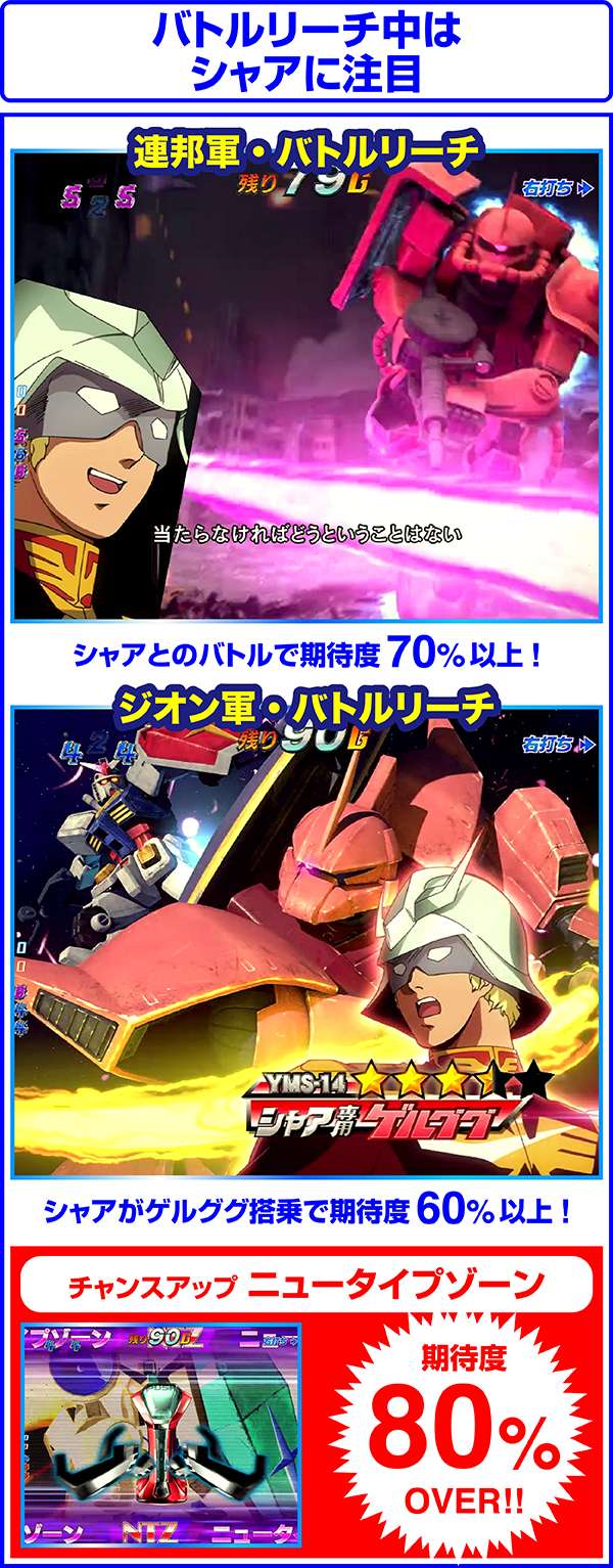 対戦相手がアッザムやギャンなら勝利濃厚。ニュータイプゾーンは突入するほど期待度が上昇し、3回突入すれば超激アツ!?