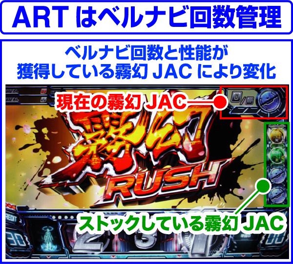 ART突入時に得た霧幻JACの種類により、ARTの継続ゲーム数が変化。液晶右上に現在消費中の霧幻JAC、右中にストックしている数が表示される。