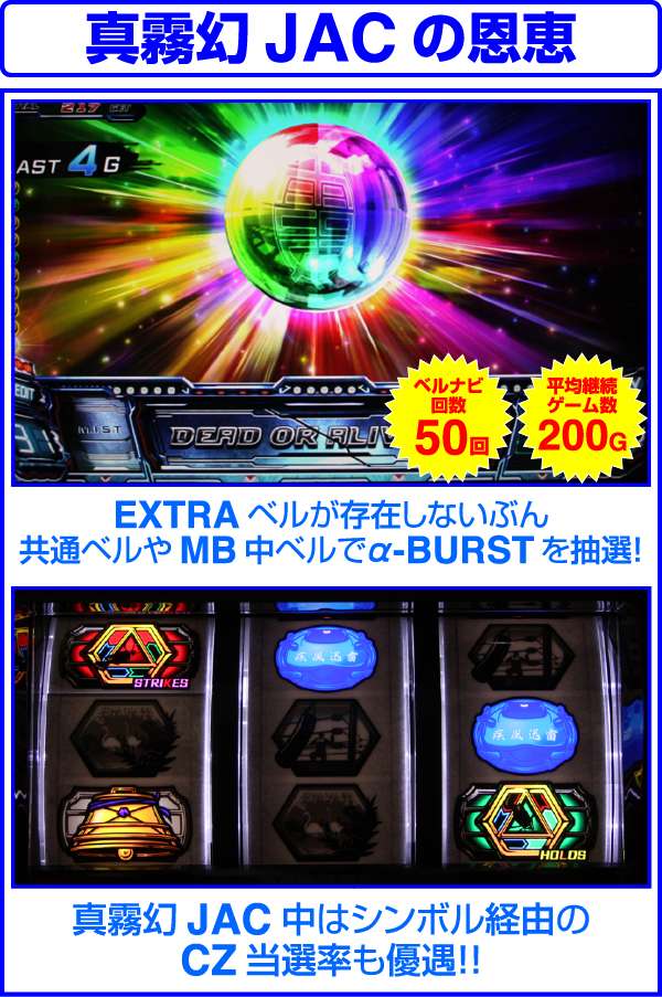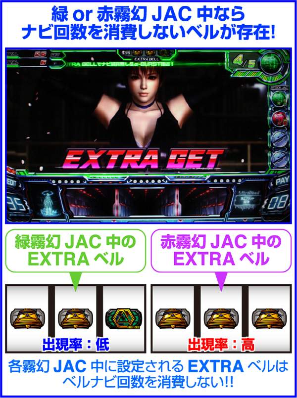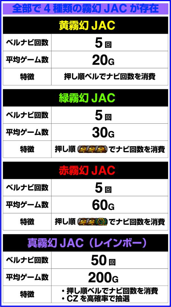 緑霧幻JAC中は押し順ベルB(ベル・ベル・緑シンボル)、赤霧幻JAC中は押し順ベルA(ベル揃い)がEXTRAベルとなるため、ほかの霧幻JACに比べ、抽選回数が多いぶん特化ゾーンに突入しやすくなっている。