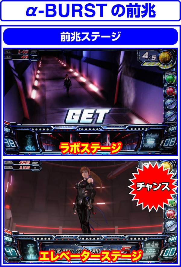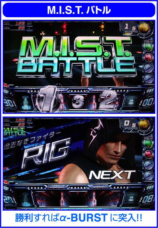 「α-BURST」の前兆であるラボステージやエレベーターステージに移行すればチャンス。各ステージから連続演出である「M.I.S.T.バトル」発展となる。