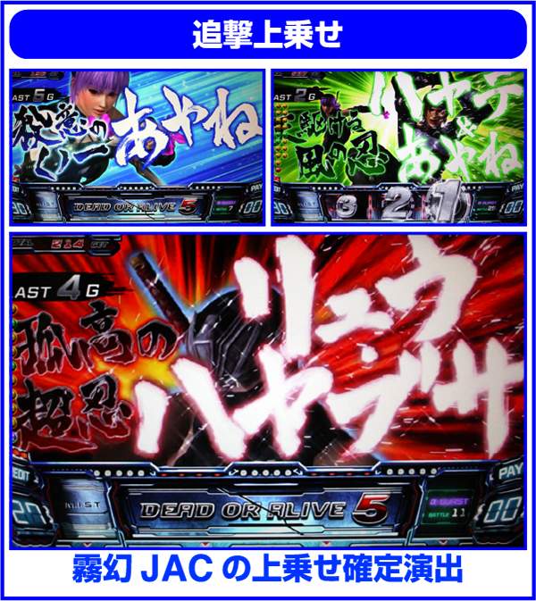 かすみの攻撃が当たったあとに発生する可能性がある上乗せ演出。かすみの攻撃HITでゲットした霧幻JACに加え、追撃が発生した回数分の霧幻JACを獲得できる。