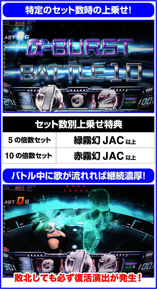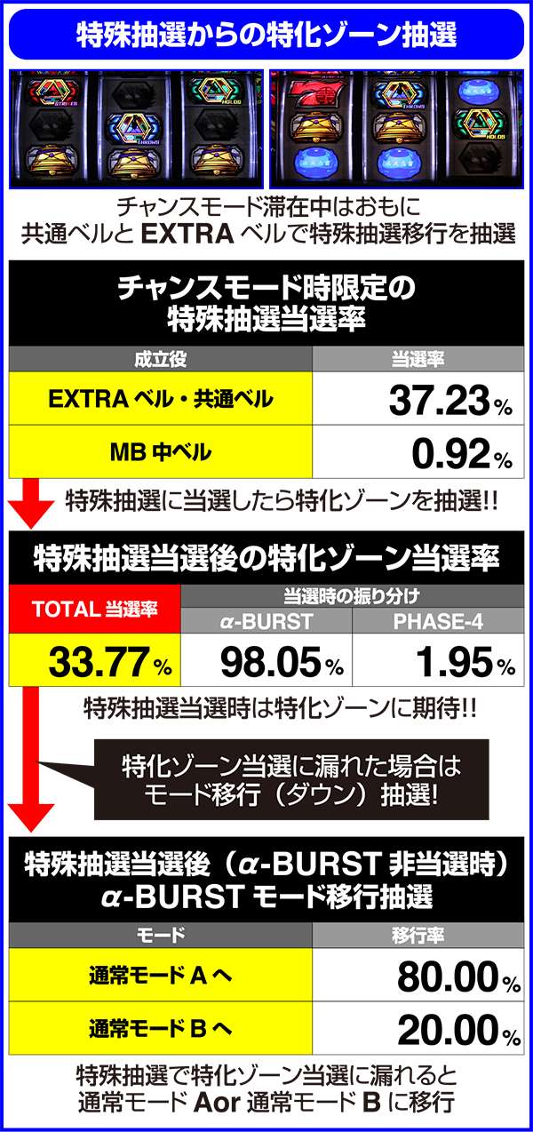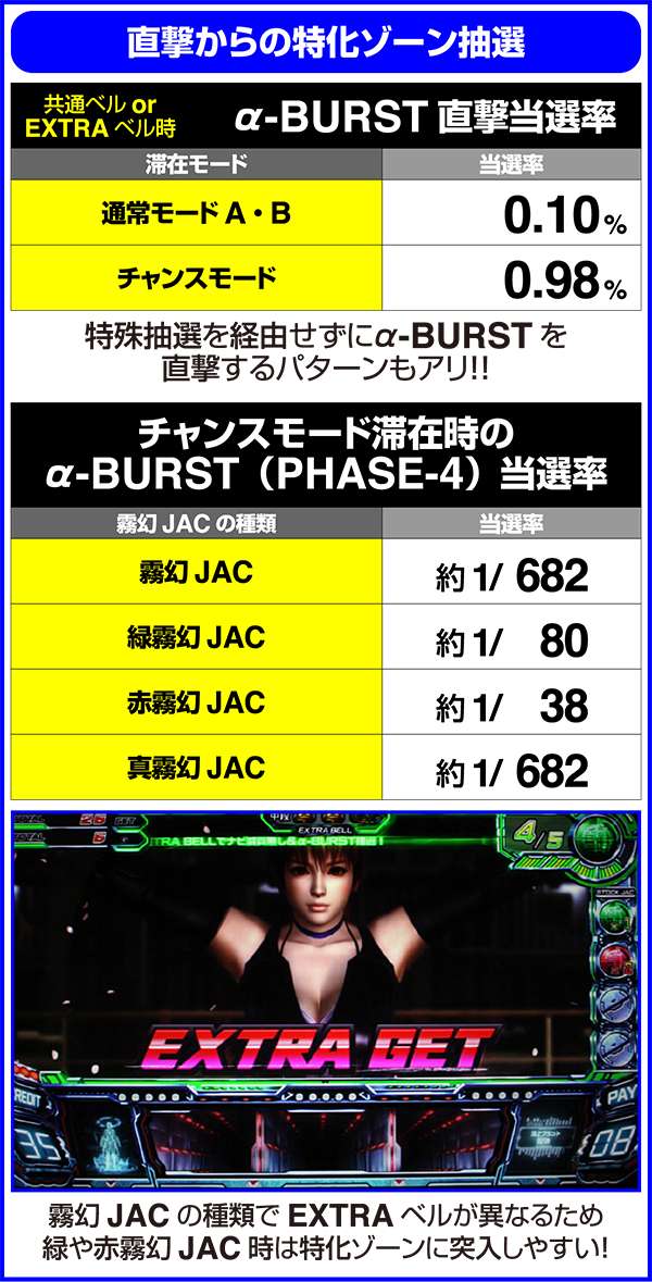 また、EXTRAベル当選時は上乗せ特化ゾーンである「α-BURST」が抽選される。