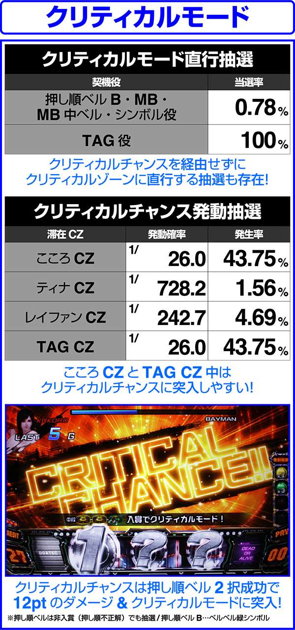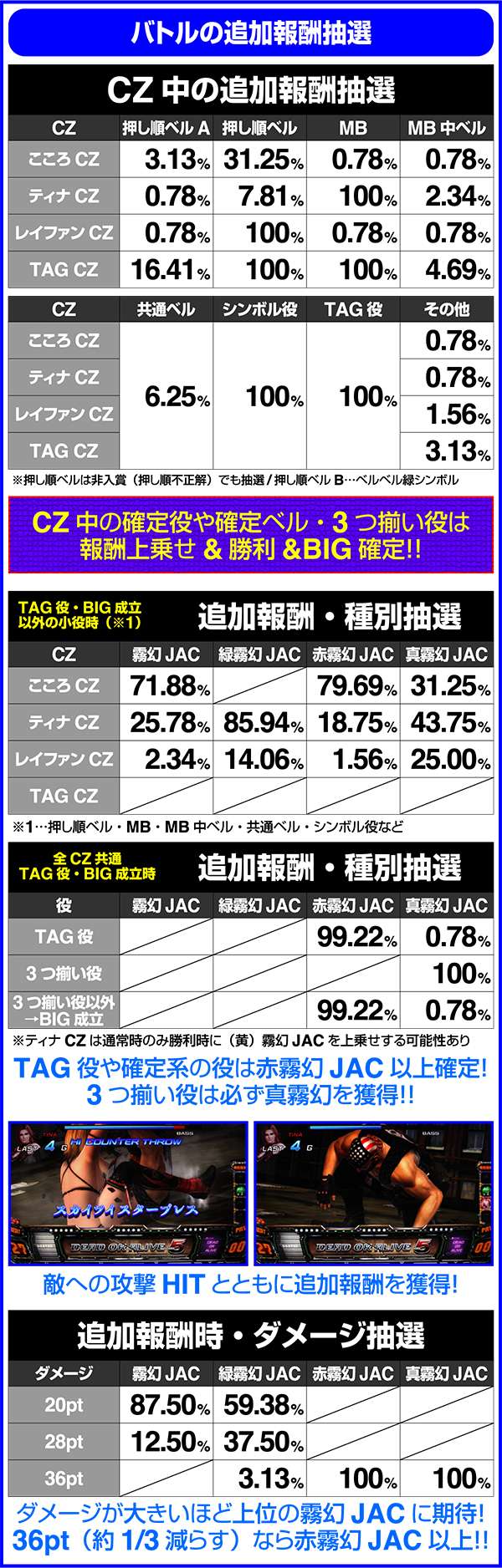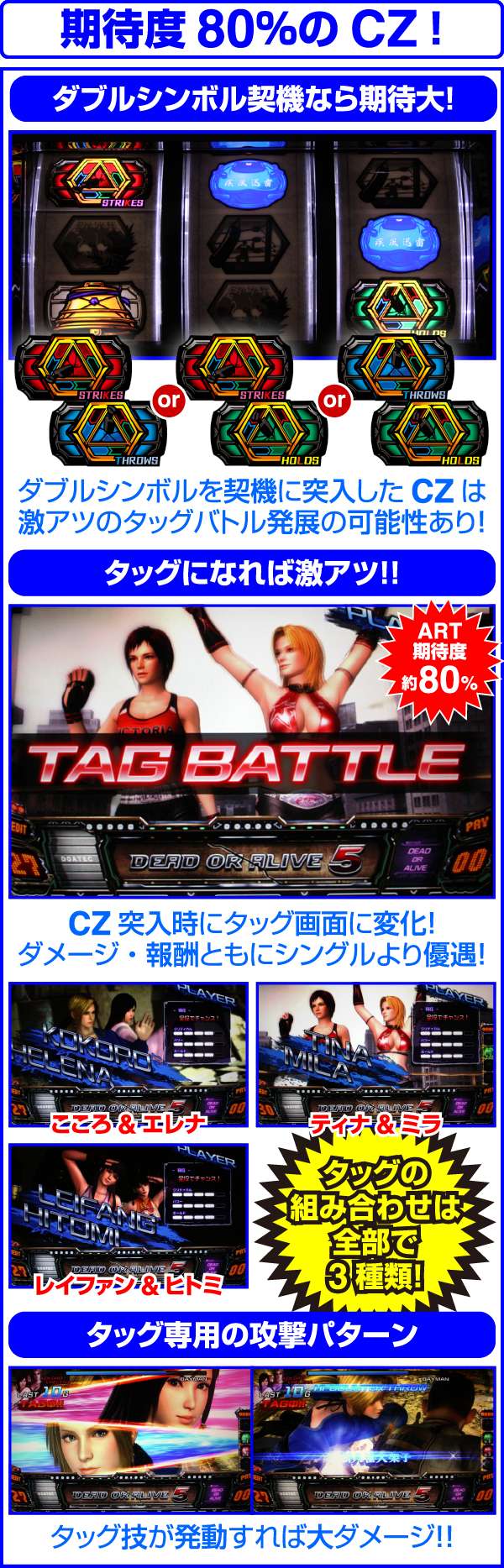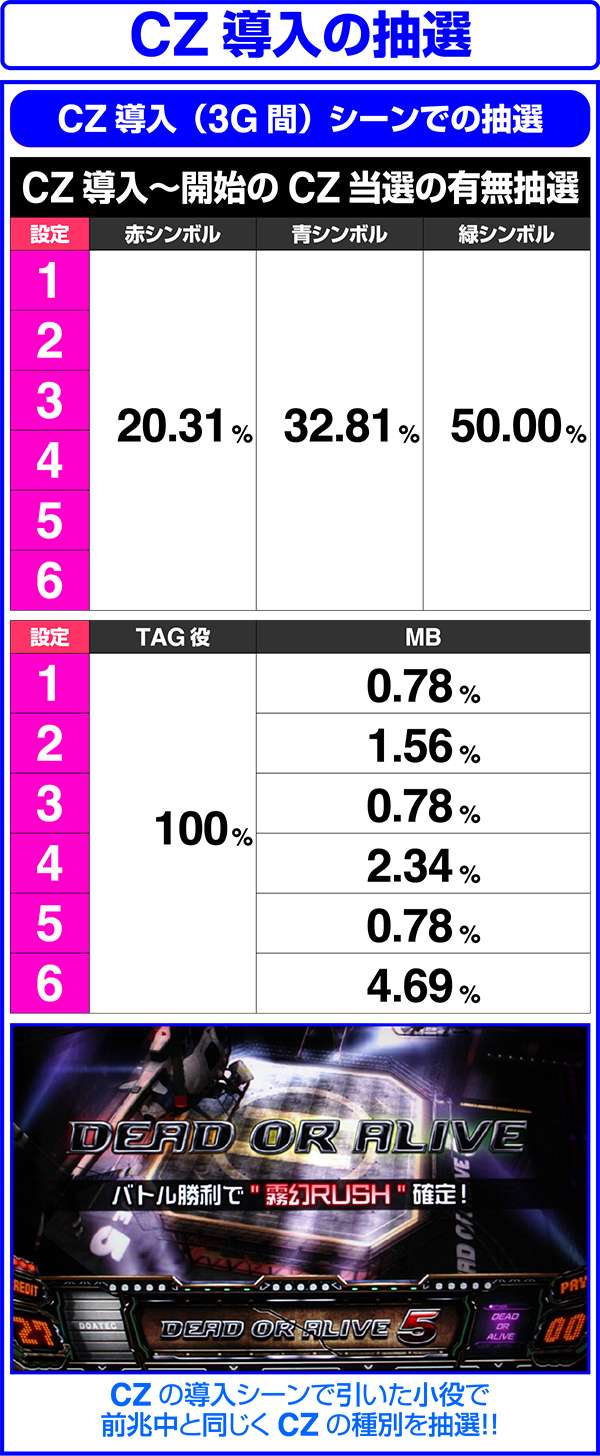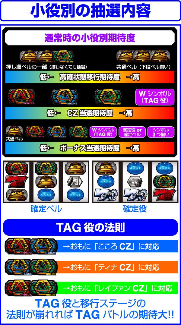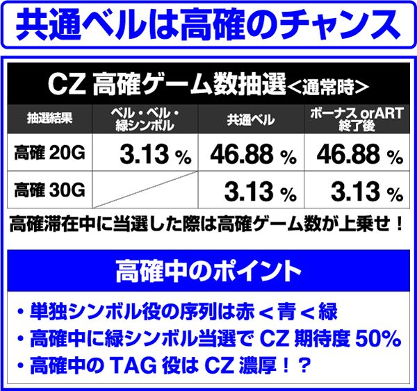 導入シーンにおける抽選の流れはCZの前兆中とほぼ同じで、もともろ当選しているCZと別のCZが当選すればTAG CZに格上げされる。 当選率は高確中とほぼ同じ数値なので、レア役を引けば十分期待できる。