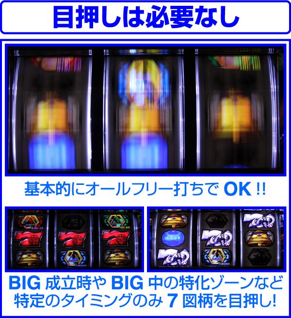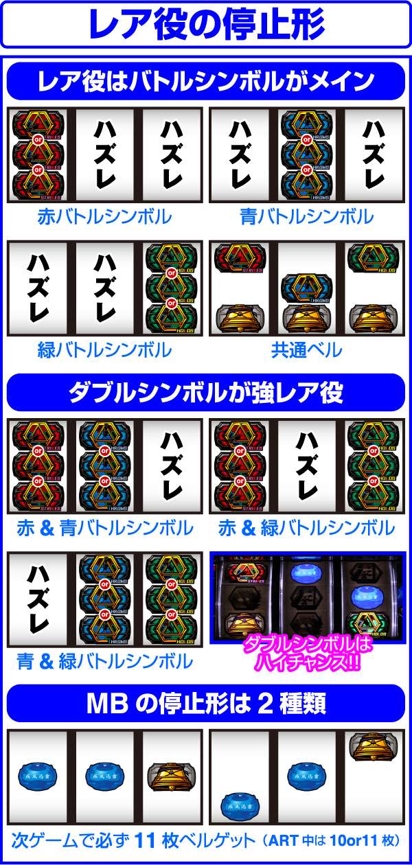 レア役のメインとなるシンボル成立時は、第3リール停止時にシンボルが停止しているリール以外が消灯するため、出現時はわかりやすくなっている。もちろんシンボルが出現していても小役が揃えばNG。あくまでシンボルが出現かつ小役が揃っていない停止形がレア役となる。