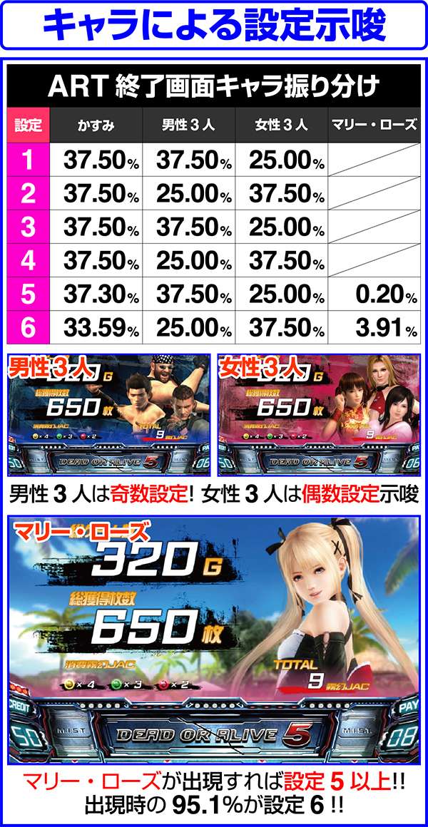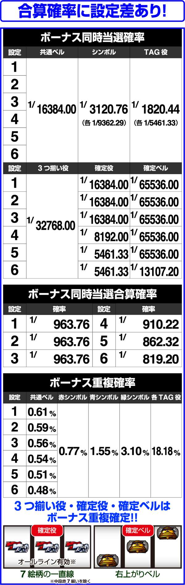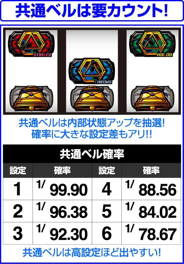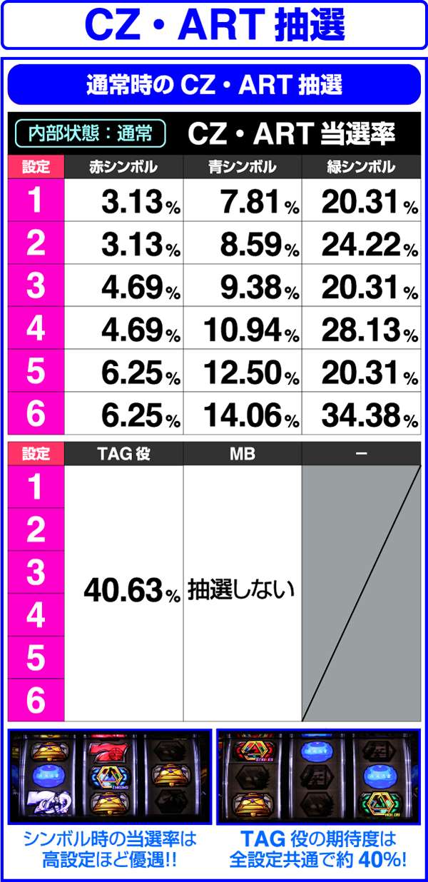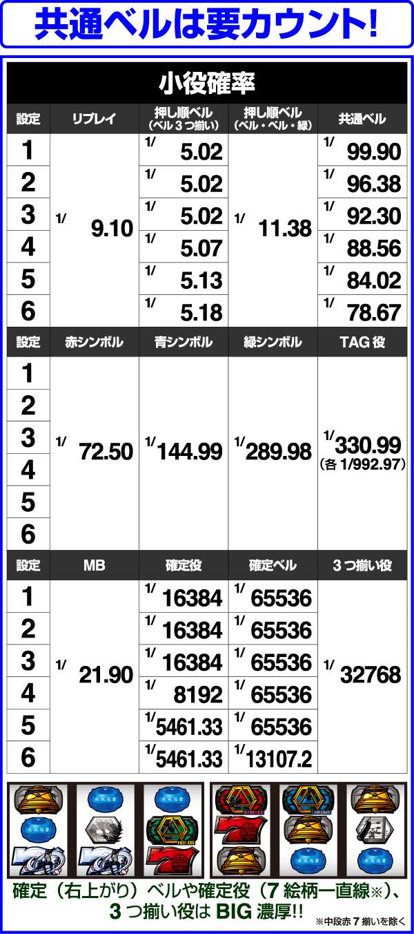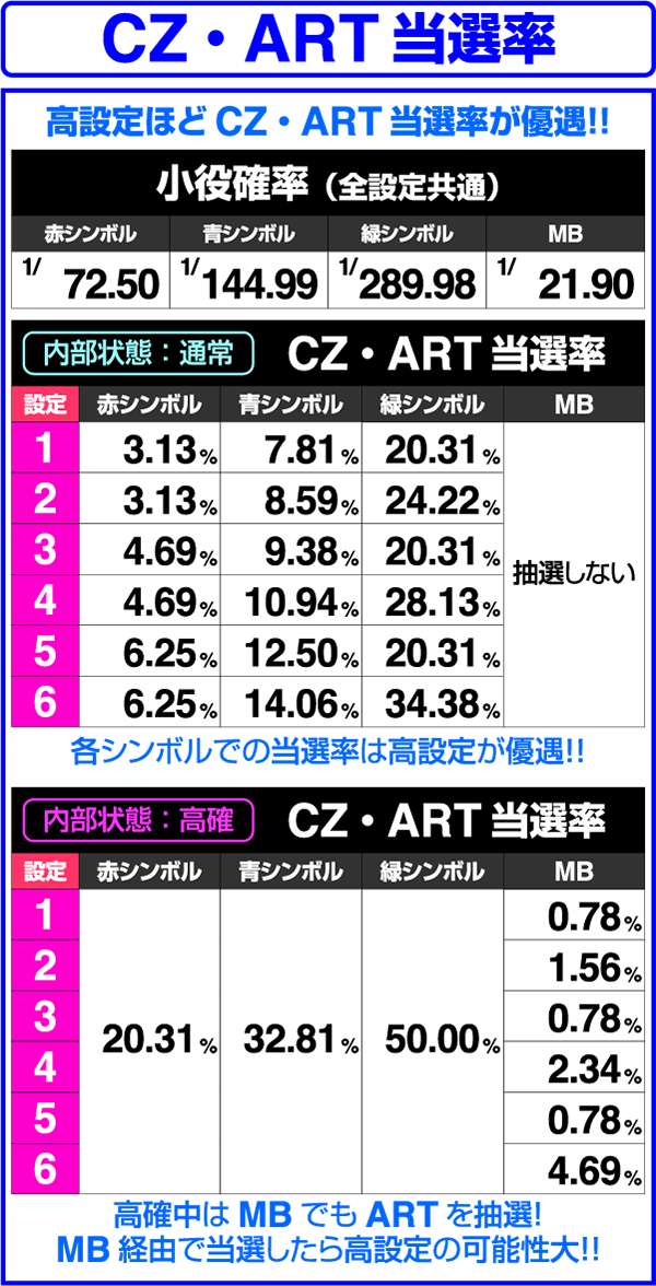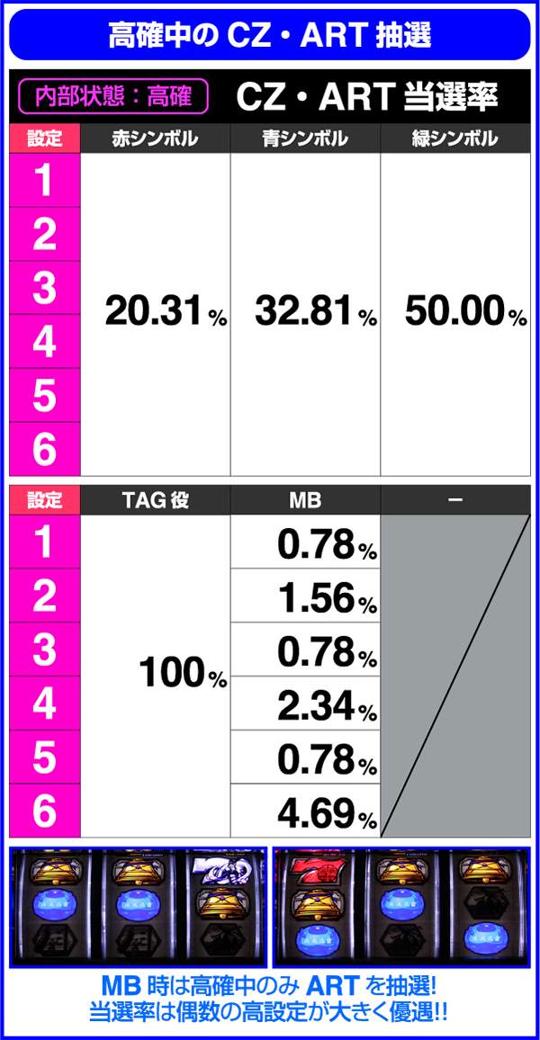 また、MB経由の抽選は高確中にのみおこなわれ、当選率は偶数設定かつ高設定が大きく優遇される。