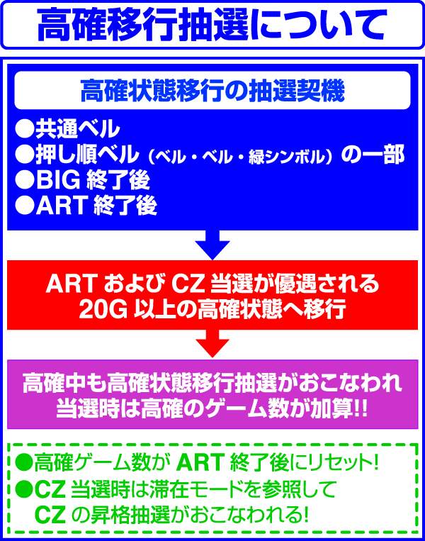 さらに、ART中はMB中ベル、EXTRAベル、共通ベル成立時にモードの移行抽選がおこなわれる。
