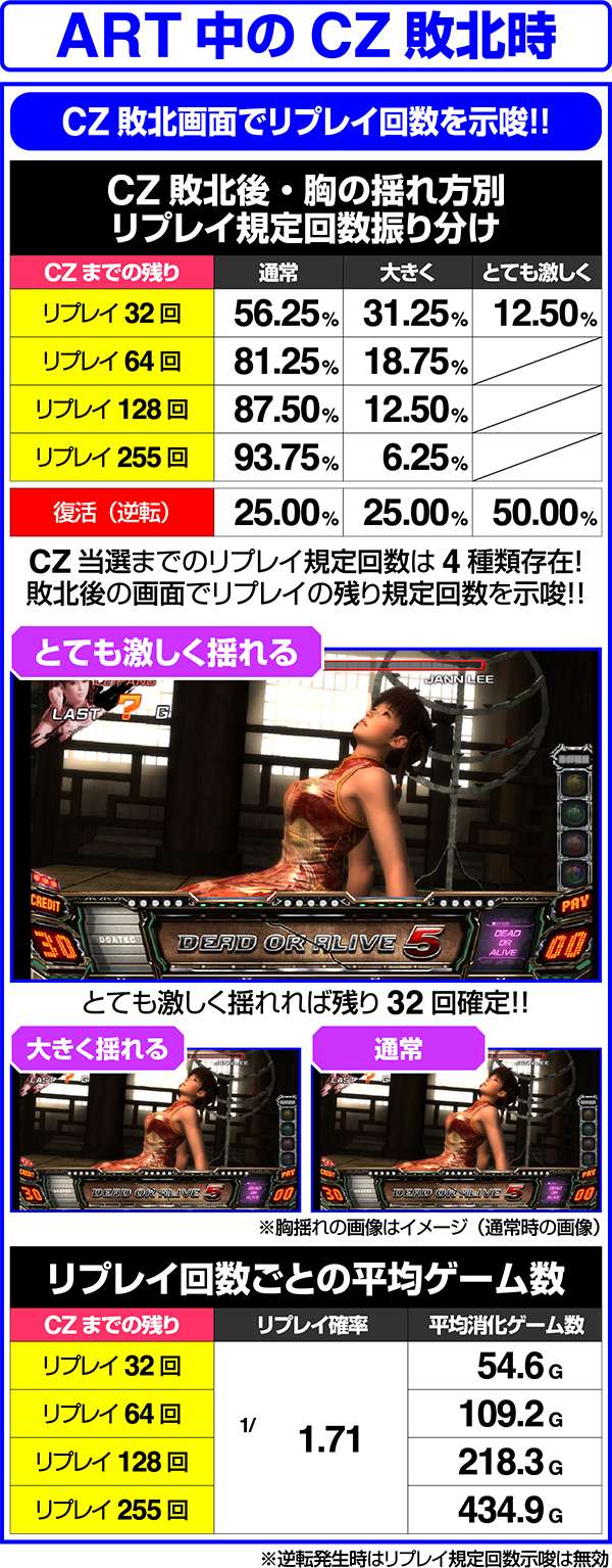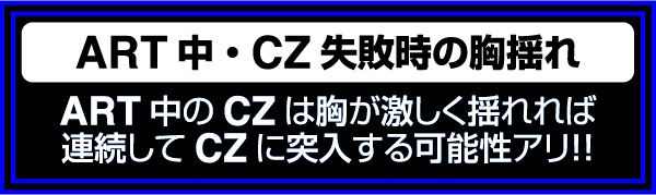 ART中の胸揺れは次回CZ当選までのリプレイ規定回数を示唆しており、激しく揺れるほど規定回数が少ない可能性が高い。そのため、短いゲーム数でのCZ当選に期待できる。