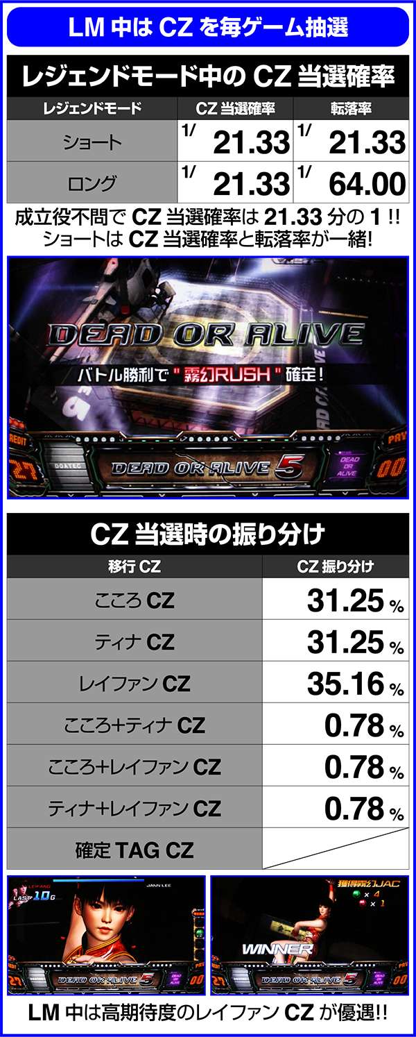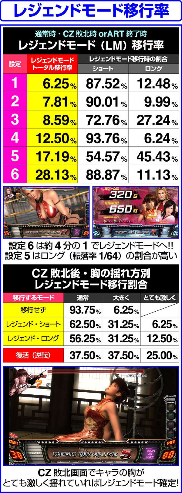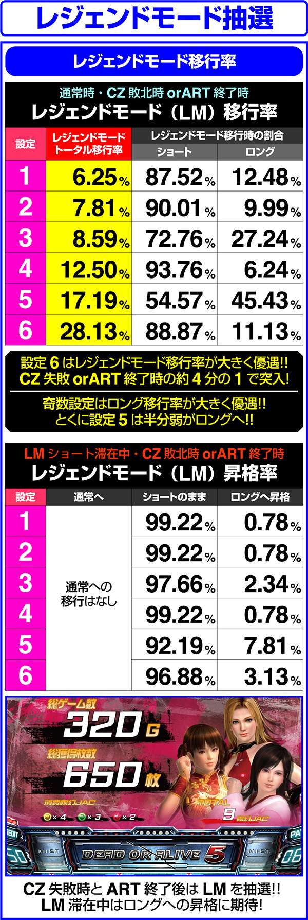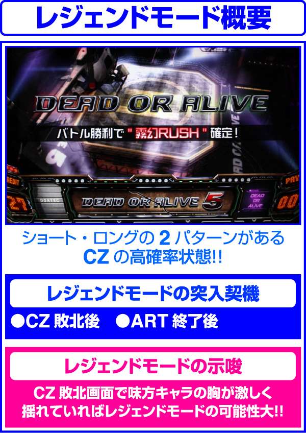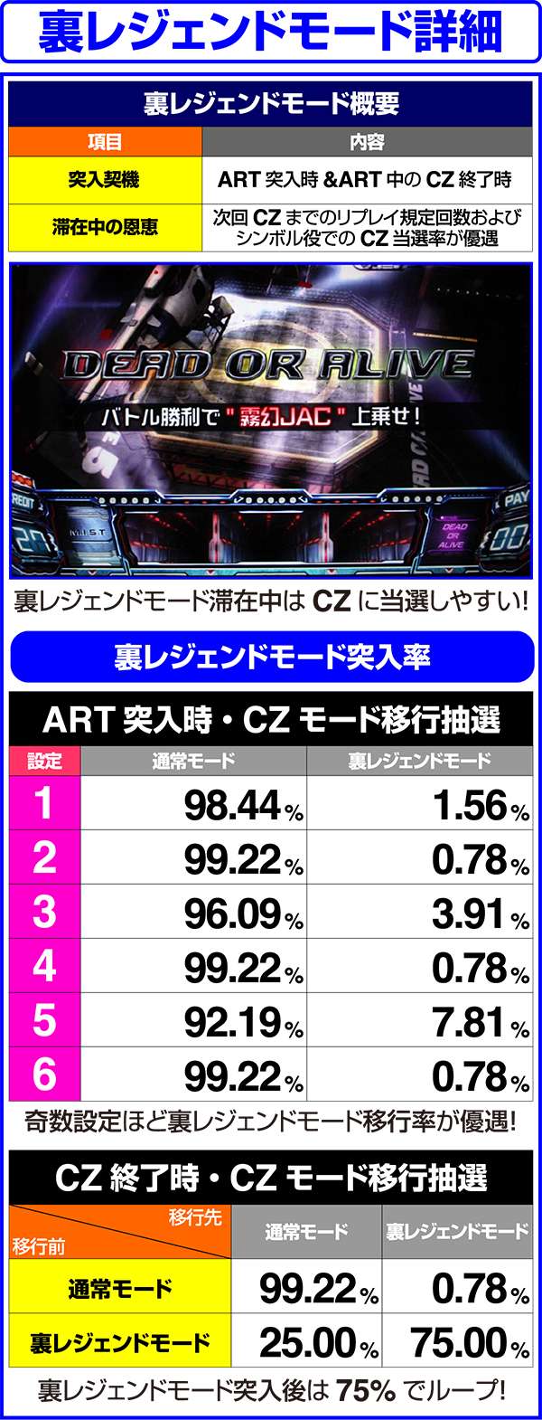 CZの高確状態であるレジェンドモードにはショート・ロングの2パターンがあり、滞在中は成立役不問でCZが抽選される。レジェンドモード移行率は高設定ほど優遇されるため、CZ終了後やART終了後に高確の可能性があるBARステージに移行しやすいようなら高設定への期待が高まる。