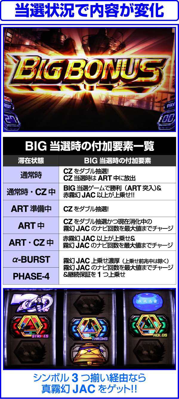 MB中のナビ回数の減算はおこなわれない。また、各霧幻JAC中にBIGボーナスに当選した場合はナビ回数がリセットされる。ちなみに、黄や緑の霧幻JAC突入時に赤に昇格する可能性もあり、一度昇格したら以降も昇格しやすくなる。