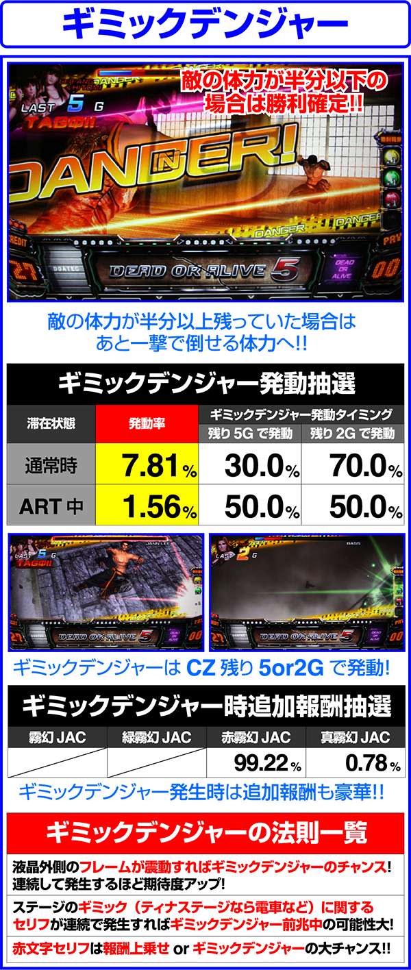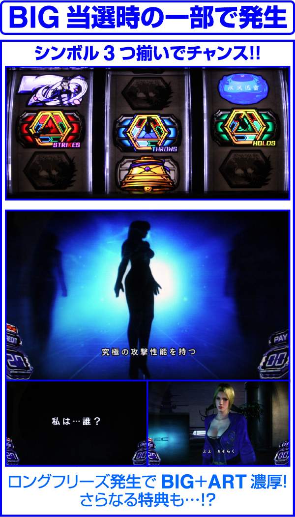絶大なる人気を誇る格闘ゲームがパチスロとして登場。 スペックはボーナス+ARTとなっており、出玉増加の鍵となるのは1Gあたりの純増約1.74枚のART「霧幻RUSH」。 通常時におけるゲーム性は、レア役であるバトルシンボルを引き当て、CZ「DEAD OR ALIVE」に突入させ、ARTを勝ち取るという流れとなる。 また、基本的に小役の取りこぼしはないため、ナビ発生時以外はフリー打ちでOKだ。 |