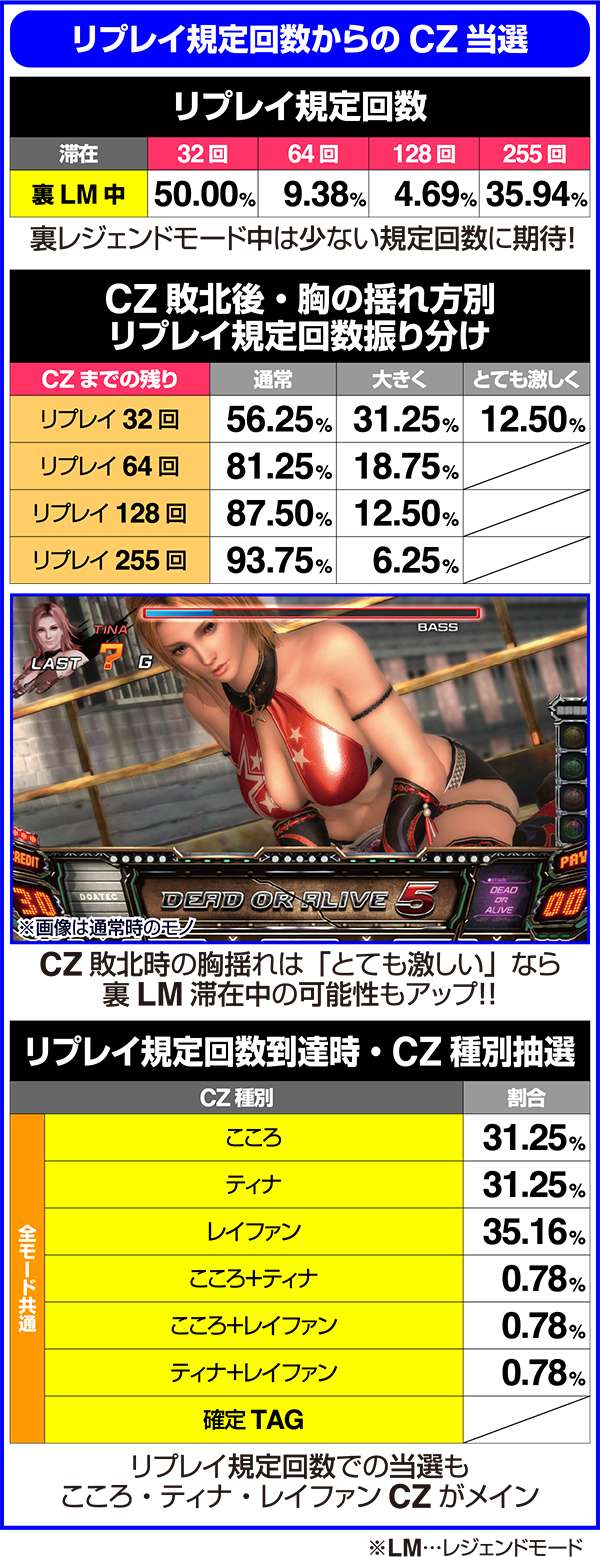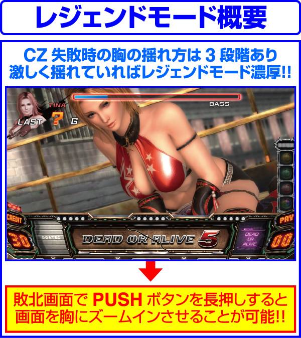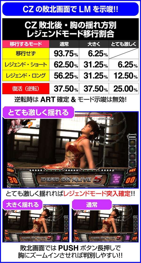 CZ敗北時のキャラの「胸の揺れ方」には段階があり、激しく揺れるほどCZの高確状態「レジェンドモード」に移行する可能性がアップ。