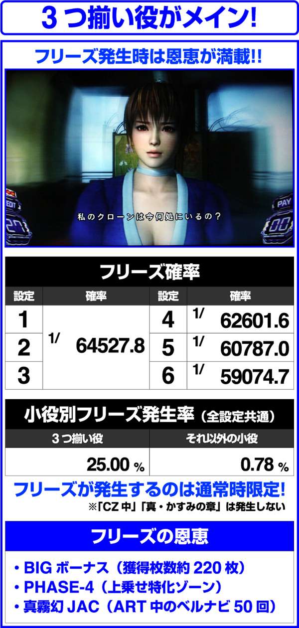 3つ揃い役からのボーナスにおける25%がフリーズ抽選に当選となるだけに、成立時は期待したいところだ。