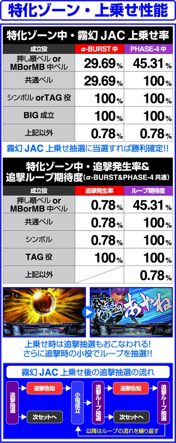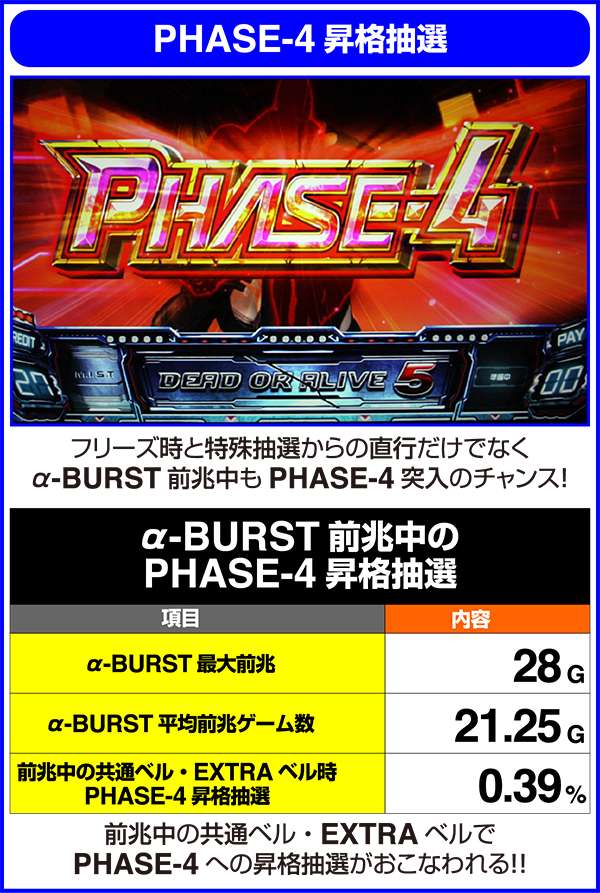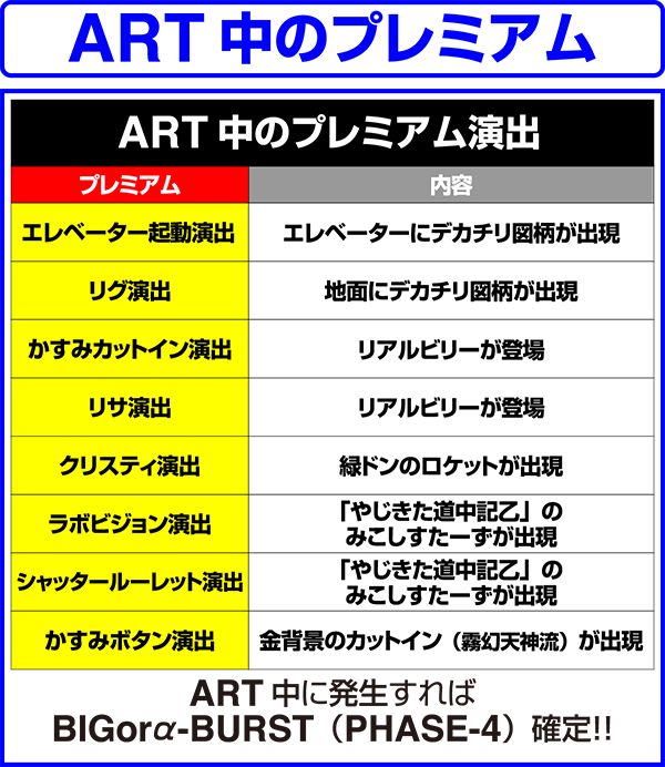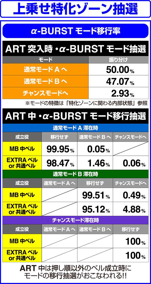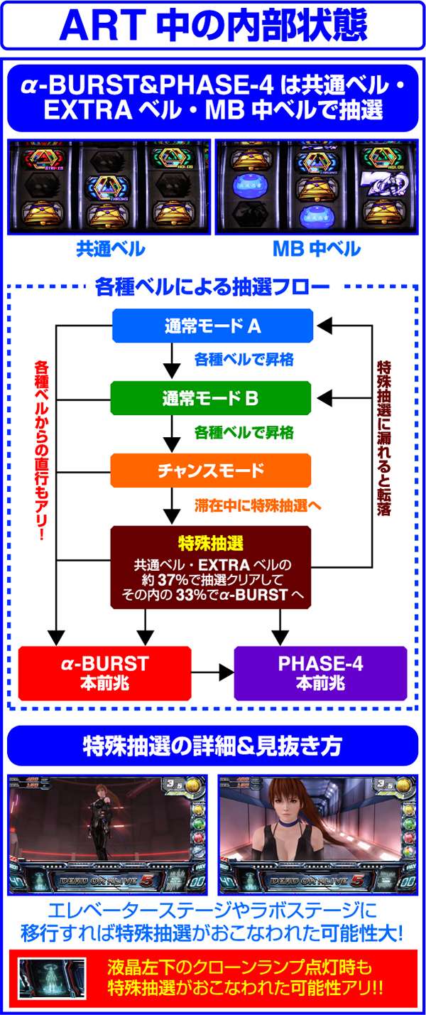 ART突入時には、特化ゾーン(α-BURSTorPHASE-4)の当選率に関わるα-BURSTモードが抽選。