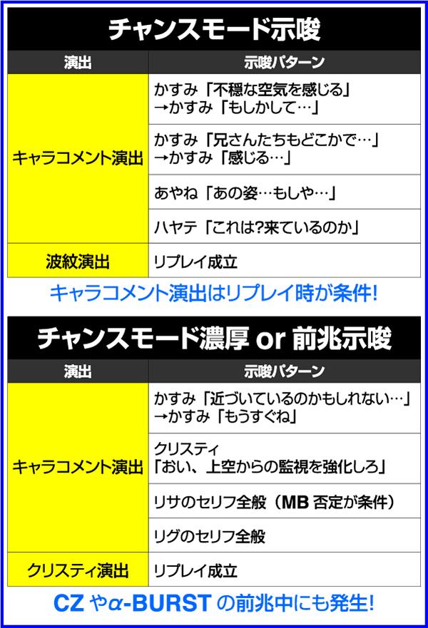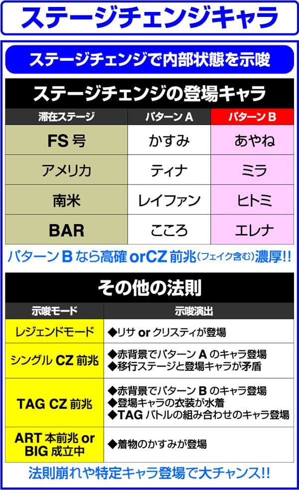 ステージチェンジ演出で登場するキャラは内部状態及び前兆を示唆しており、表内・パターンBのキャラが登場すれば高確orフェイクを含むCZ前兆濃厚。