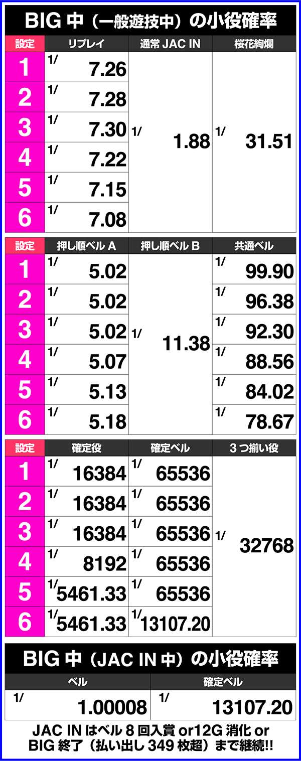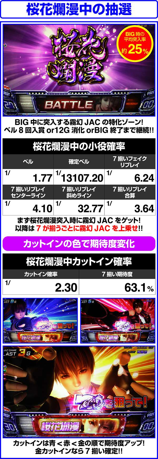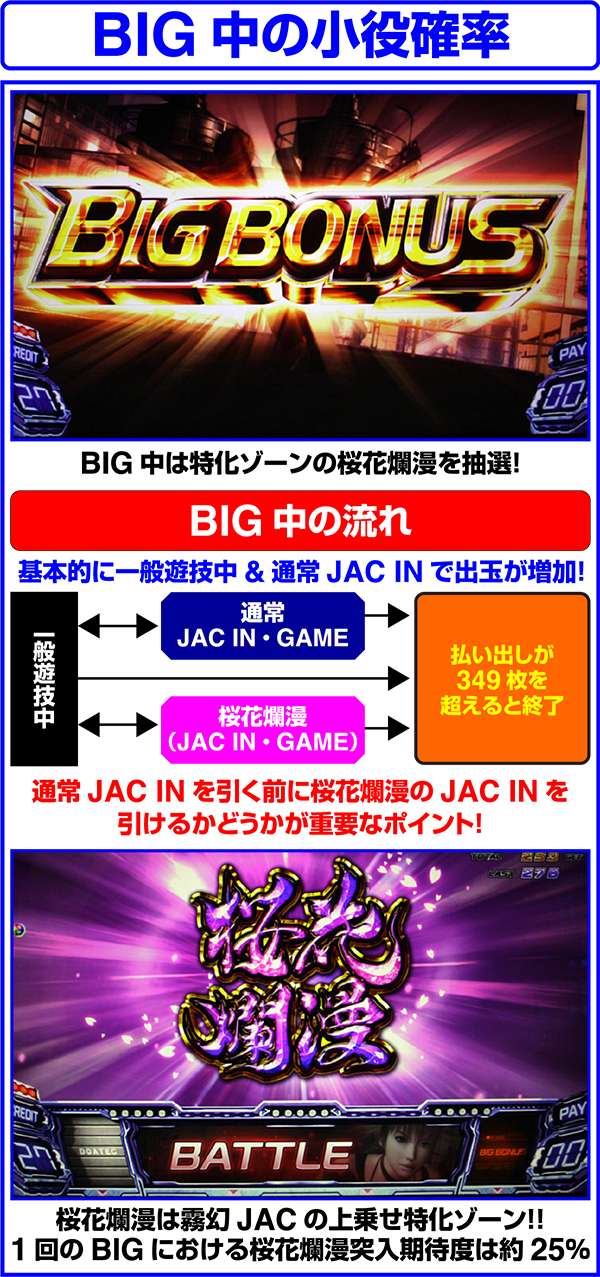 BIG中は一般遊技とJAC IN(GAME)を繰り返しつつ出玉を増やしていき、払い出しが349枚を超えると終了となるのだが、JAC INには「通常JAC IN」と「桜花爛漫」の2種類があり、一般遊技中に通常JAC IN(1/1.88)より先に桜花爛漫のJAC IN(1/31.51)を引くことができれば特化ゾーン・桜花爛漫に突入。