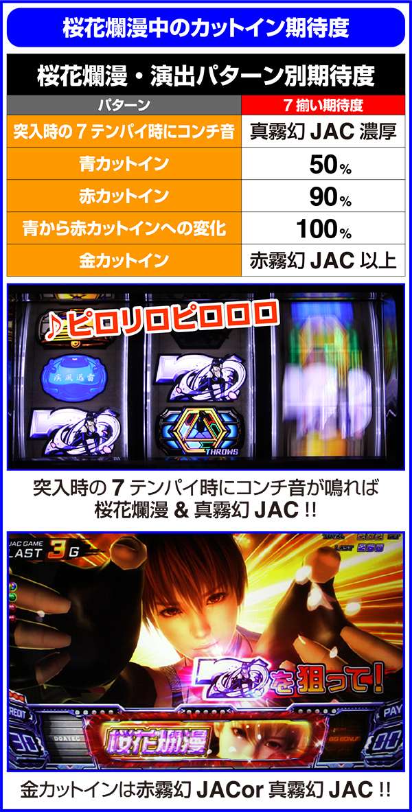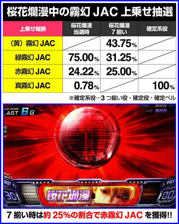 桜花爛漫はプレミアムJAC IN的な存在で、滞在中は約3.64分の1で霧幻JACを上乗せ。さらに上乗せ時の約4分の1で赤霧幻JACとなるため、大量出玉のトリガーともなりえる。