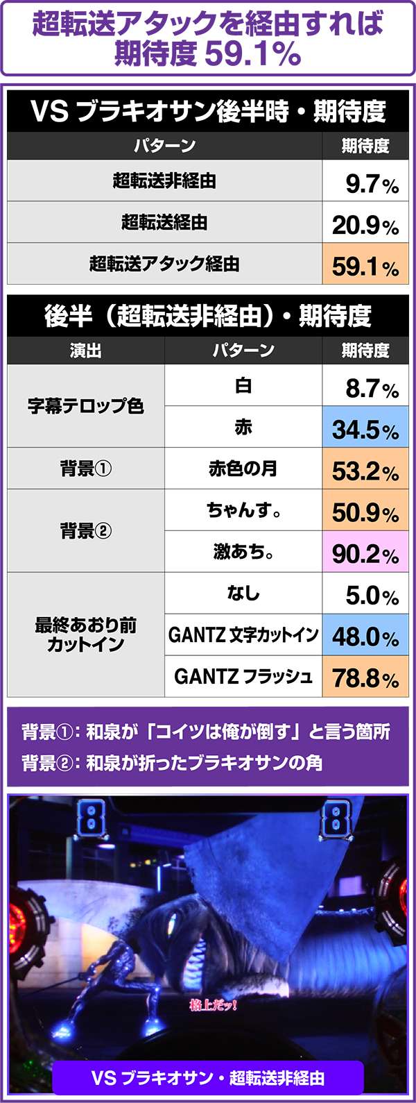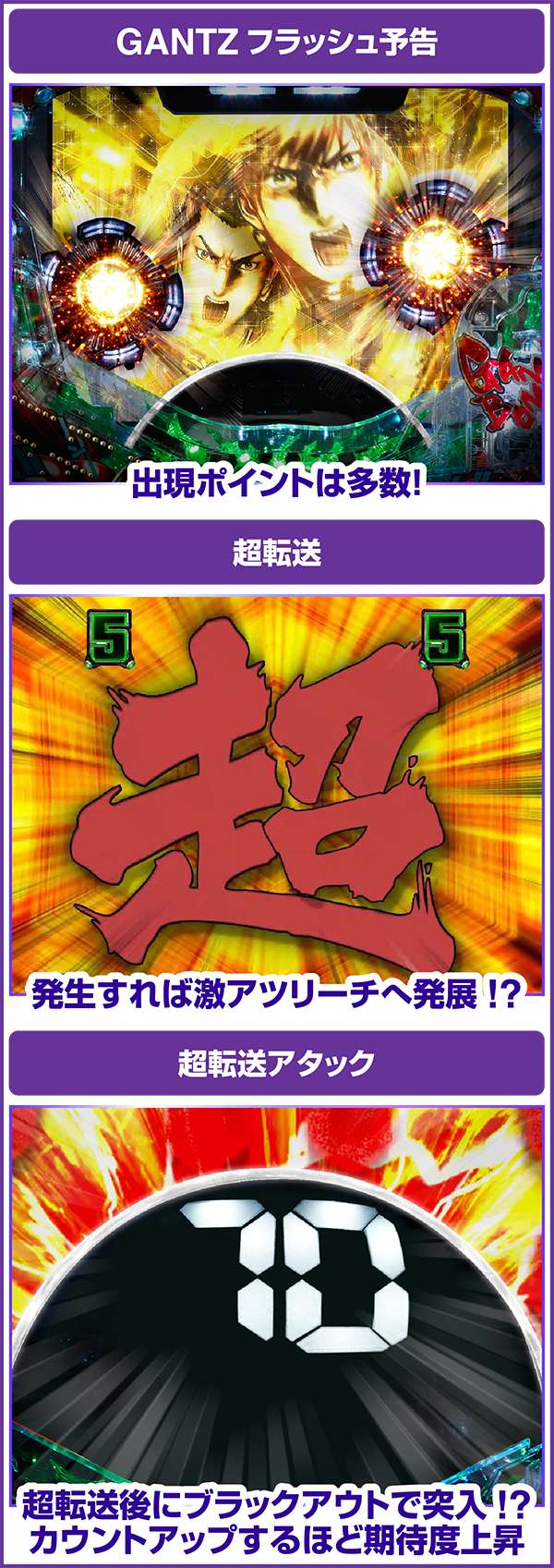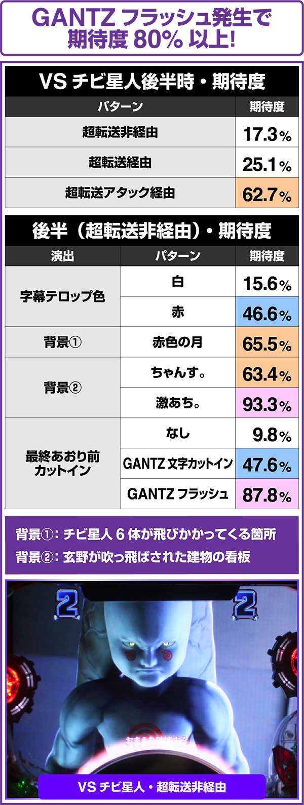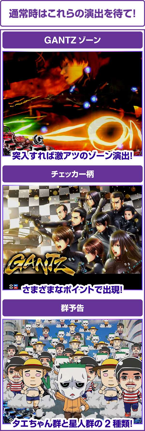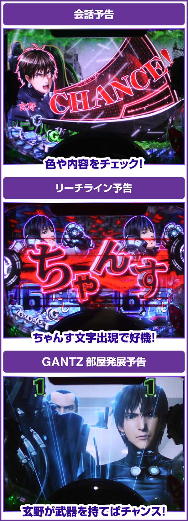 GANTZ部屋発展予告はタケシとZガンの出現が大当りのカギを握る。タケシは子供で演出発生時に手前に現れ、Zガンは転送直前に玄野が構える。