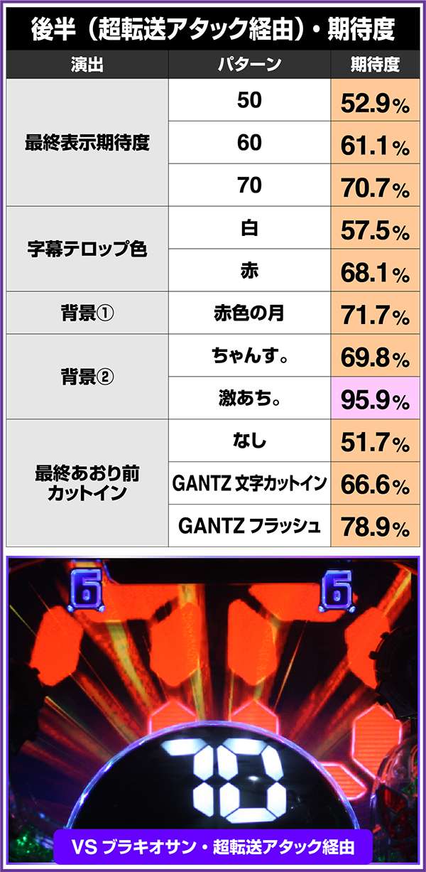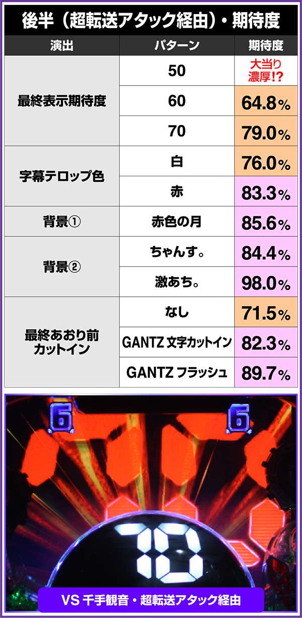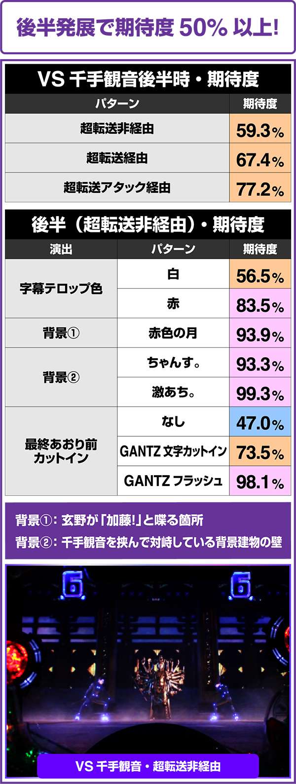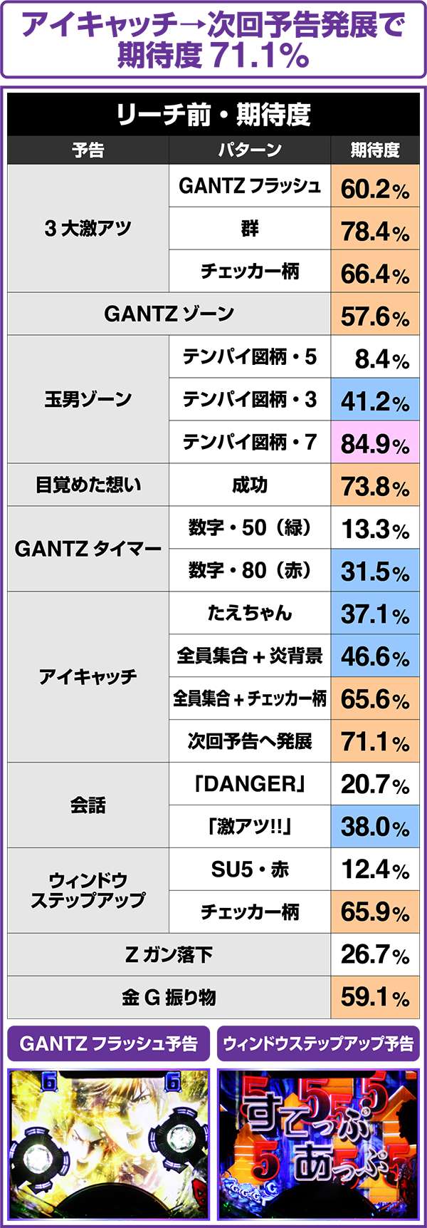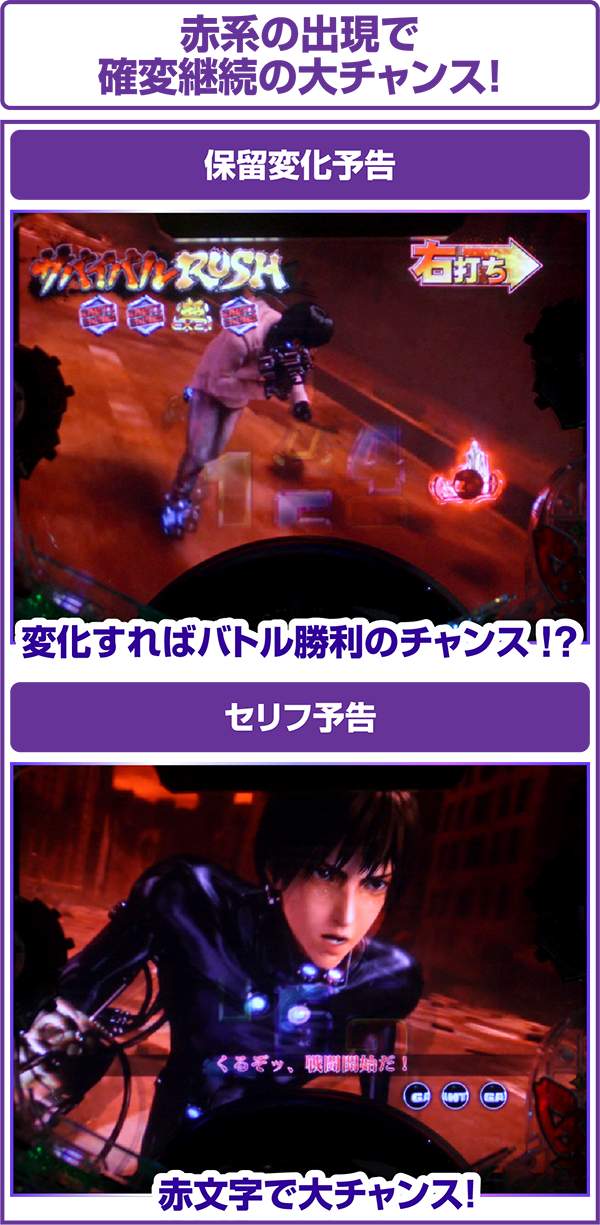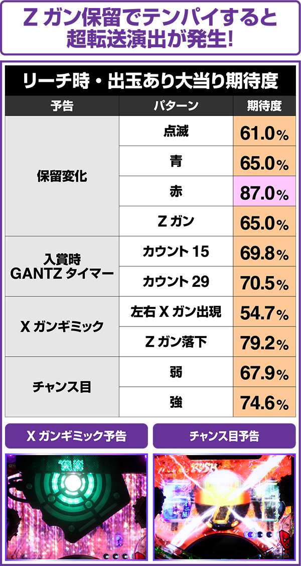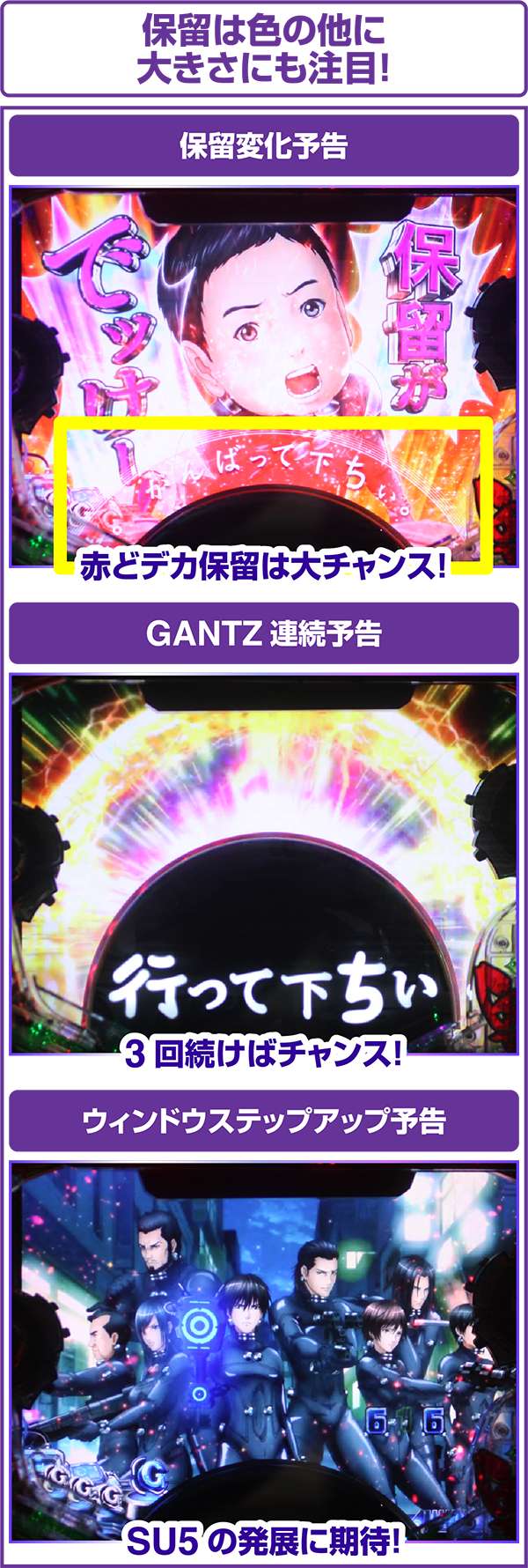 GANTZ部屋発展予告はタケシとZガンの出現が大当りのカギを握る。タケシは子供で演出発生時に手前に現れ、Zガンは転送直前に玄野が構える。