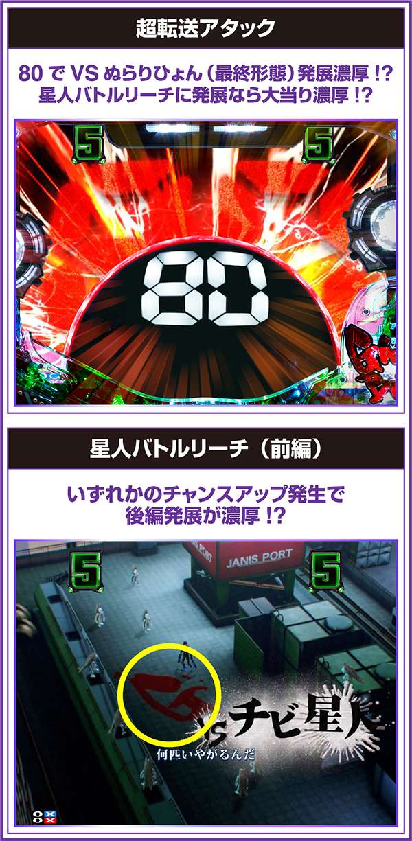 星人バトルリーチは前編と後編に分かれており、後編に発展でチャンス。後編発展時に超転送が発生すれば激アツだ!