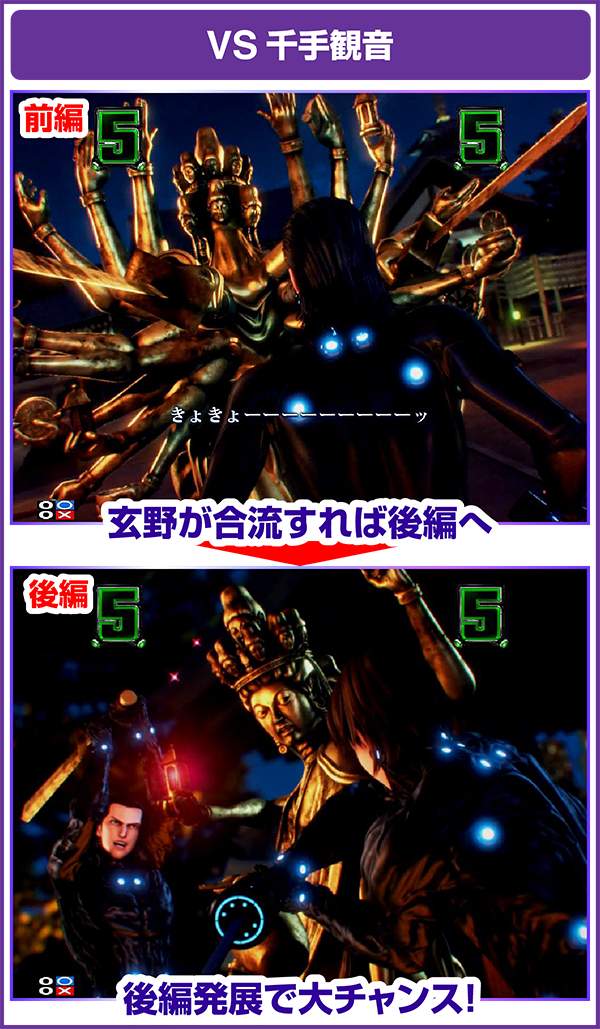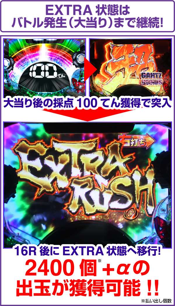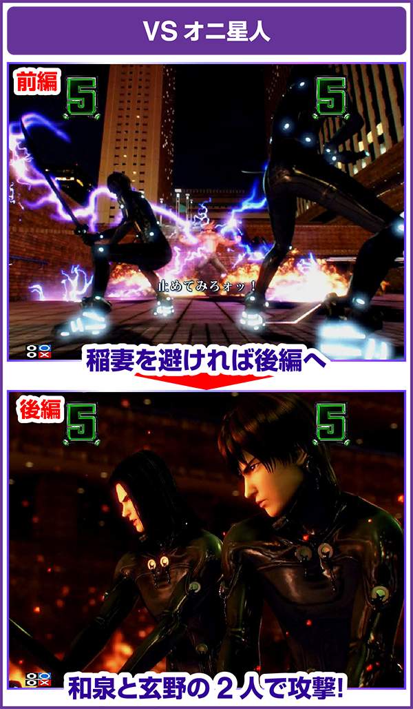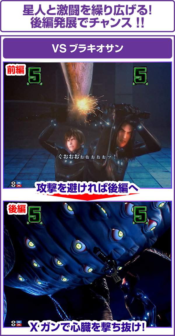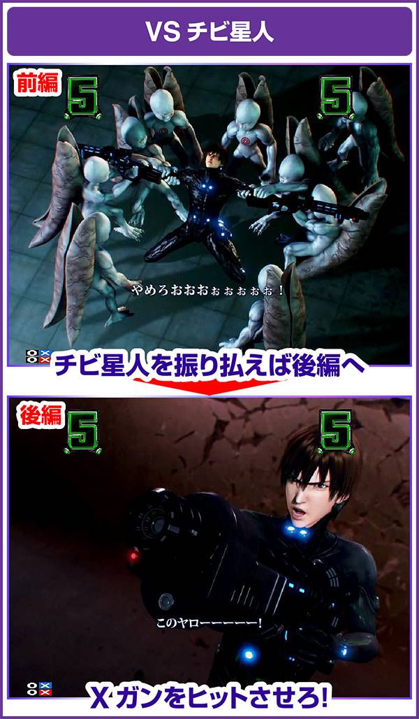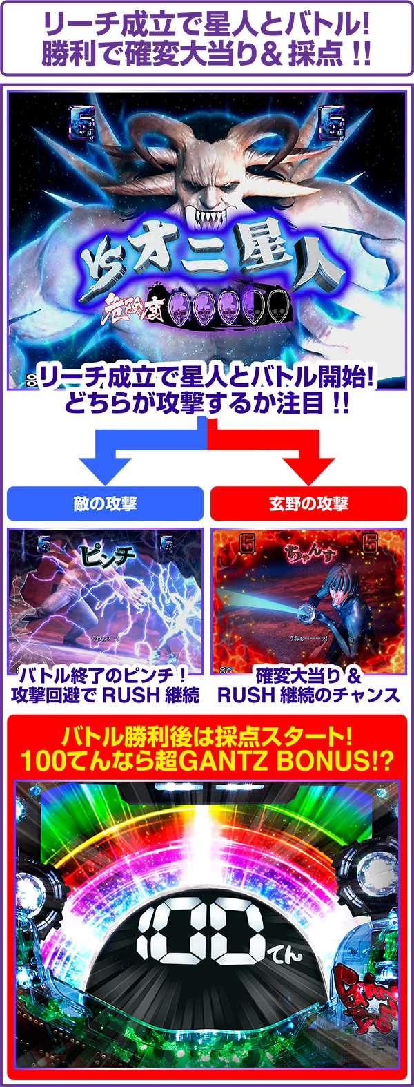 サバイバルRUSH中は星人と死闘を繰り広げる。リーチ成立でバトルに発展し、勝利すれば確変大当り。
