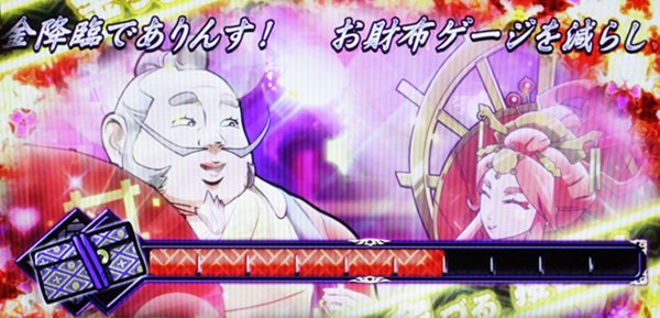 金づる接客タイム(CZ)中も内部的には奉行大戦(剛衛門ART中のCZ)と同様の抽選をおこなっており、お財布ゲージで獲得した手形の数を示唆している。