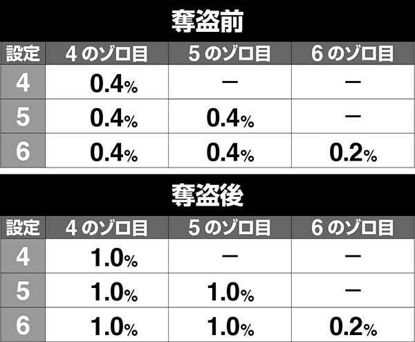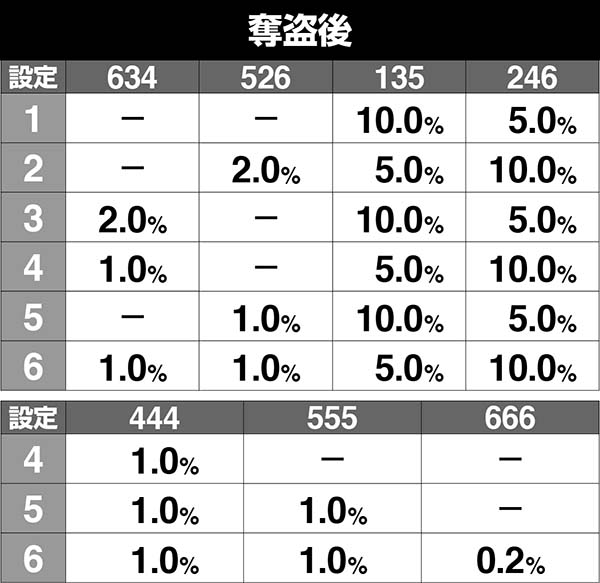 奪盗前よりも奪盗後の対決のほうが、設定4以上確定パターンが出やすいところがポイントだ。