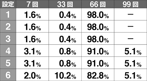 また、設定変更時は66回が天井となるが、設定4以上の場合のみ、66回を超える可能性があることも合わせて覚えておこう。