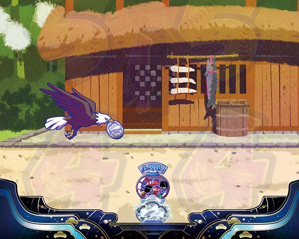 鷹がコインをガチャガチャにいれるとカプセルが出現し、中に入っている保留の色に変化。