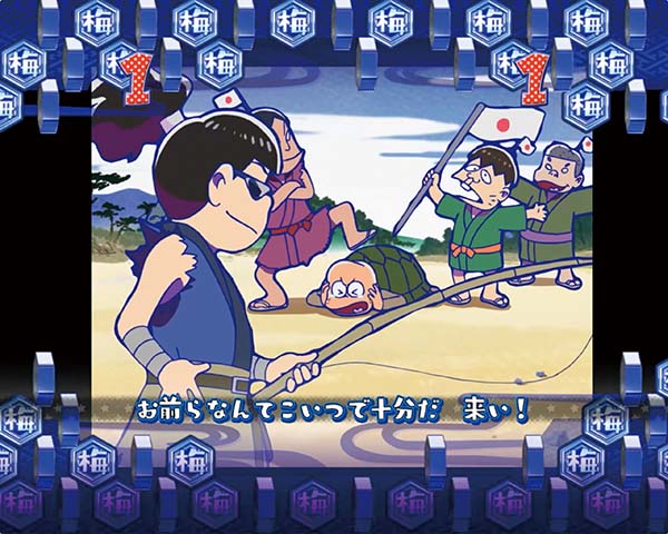 世界一人気な6つ子「おそ松さん」たちのあたらしい物語がはじまる! スペックは小当りRUSHを搭載した確変ループタイプで、特図2の大当りは50%が16R確変(約2240個)と、爆発力はライトミドルスペックの最高峰!! 昔話の世界を舞台に繰り広げられる演出もスペック同様にぶっ飛び要素が満載で、パチンコファンならば誰しもが目にしたことのあるような、ないような演出がふんだんに詰め込まれている!? |