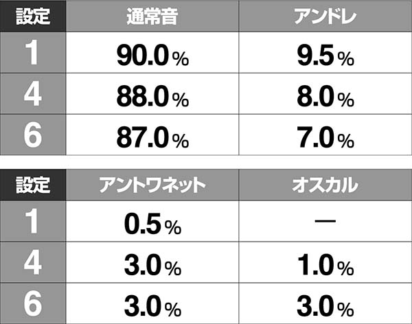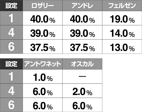 アントワネットは偶数設定で出現しやすく、オスカルは設定4以上となる。